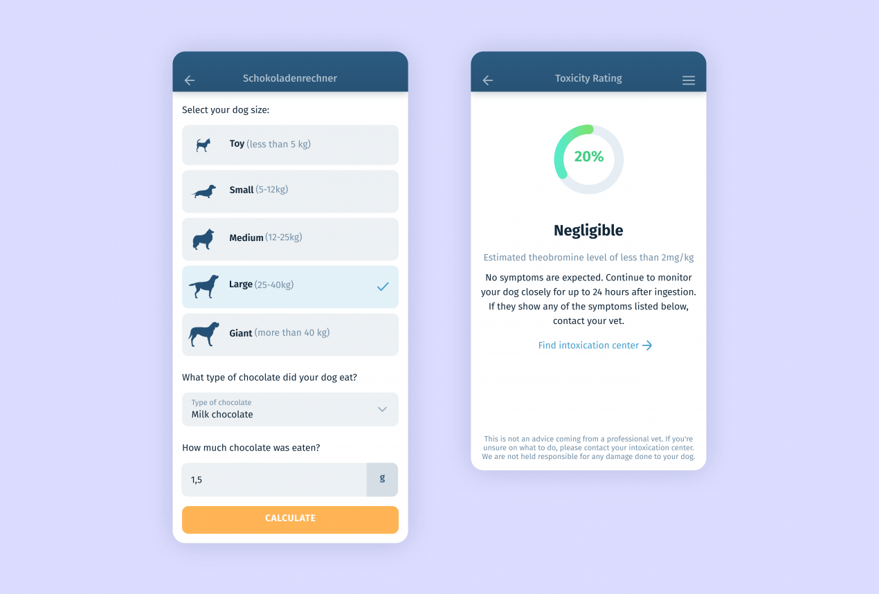 3. Калькулятор шоколада — он нужен, чтобы хозяин знал, не съел ли питомец смертельную дозу шоколада. Эту идею подала заказчица — она рассказала, что питомцы часто «подворовывают» шоколад и едят без спроса. А шоколад в больших дозах смертельно опасен для собак. Хозяева паникуют и бегут к врачу, хотя опасную дозу шоколада можно рассчитать самостоятельно исходя из веса питомца;