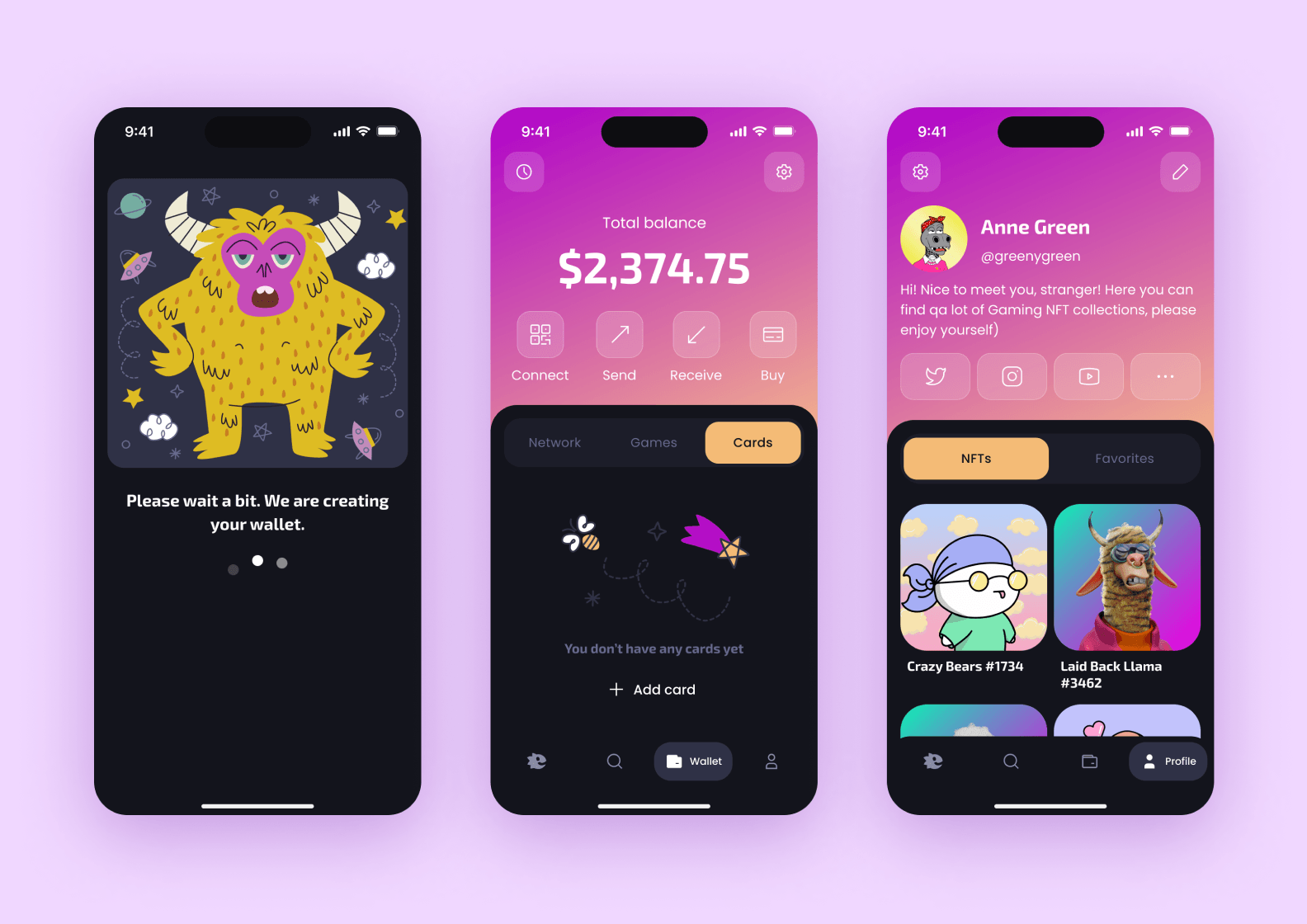 В итоге нам нужно было разработать дизайн логотипа, мобильной версии криптокошелька, раздела с NFT, а еще браузерную версию игры. И всё это быстро — пока идея остается уникальной на рынке.