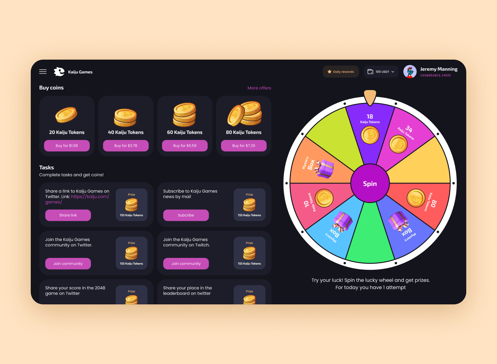 Еще одна механика — система лидерства. Лучшие игроки получают награду в виде реальных монет и токенов платформы. Чтобы вывести приз нужно… Вы угадали: пройти регистрацию в интегрированном кошельке.