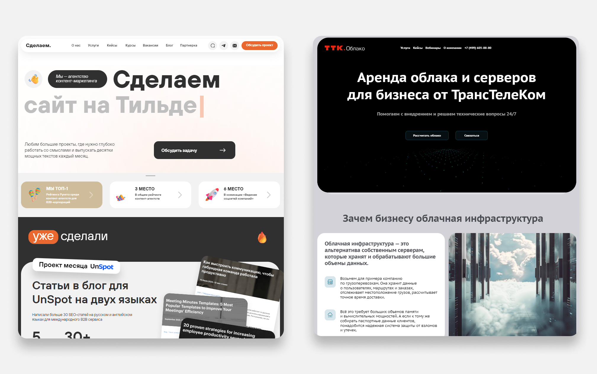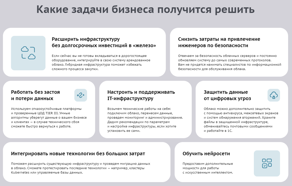 Клиенту понравился сайт «Сделаем», поэтому решили создать сайт в похожей стилистике, но на техническую тему: рассказать о сложных облачных сервисах простым языком. Так, чтобы владелец бизнеса с ходу понял, что такое облачные инфраструктуры, зачем они нужны и в какой ситуации это будет выгодно.