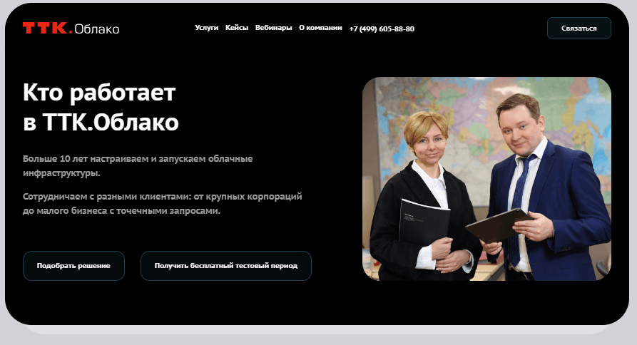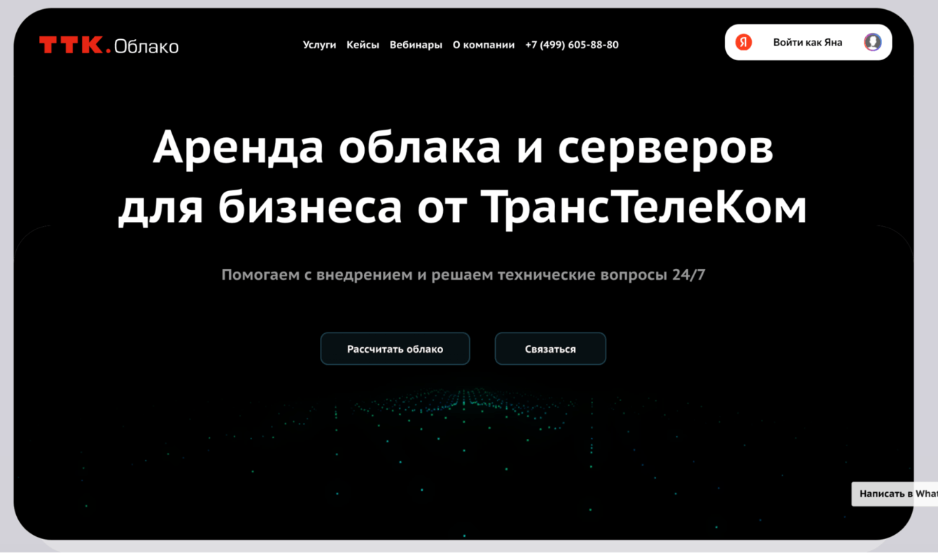 «ТТК.Облако» занимается арендой облачных инфраструктур. Предоставляет вычислительные мощности для бизнеса — помогает быстро расширить IT-инфраструктуру и перенести данные в защищенное облако. Сервису нужен был простой и понятный сайт, который легко обслуживать.