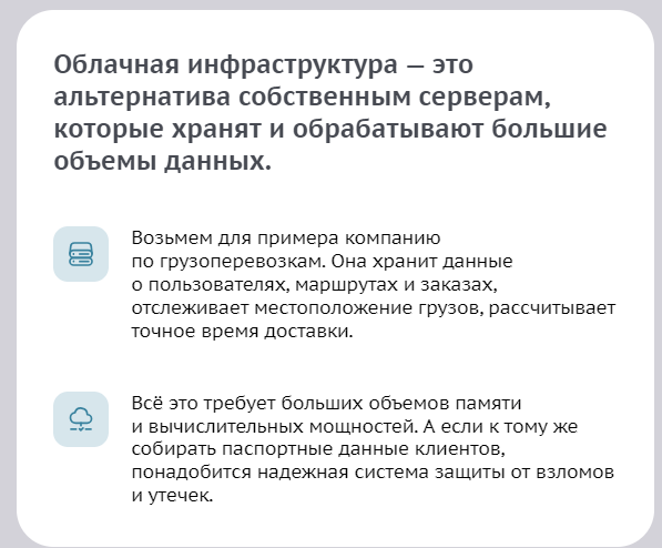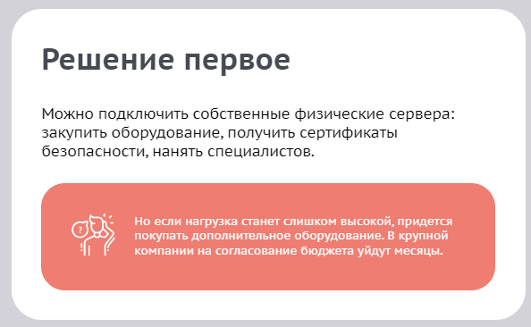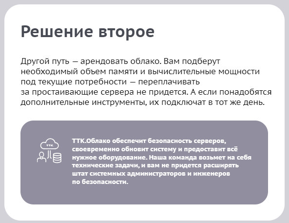 Интегрировали элемент сторителлинга. Сделали подробный блок со сравнением собственного оборудования и арендованного облака — сразу рассказали, какие решения предлагает «ТТК.Облако» и кому они подойдут.