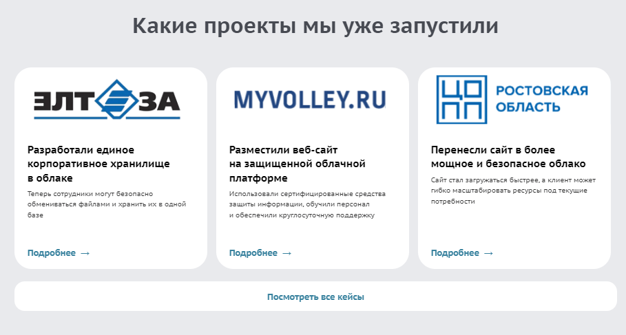 Каждую страницу с услугами мы дополнили подходящими кейсами из практики клиента. Переработали техническую фактуру, выжали самую суть и составили краткие описания. Все кейсы компании дополнительно собрали на отдельной странице.