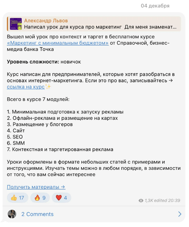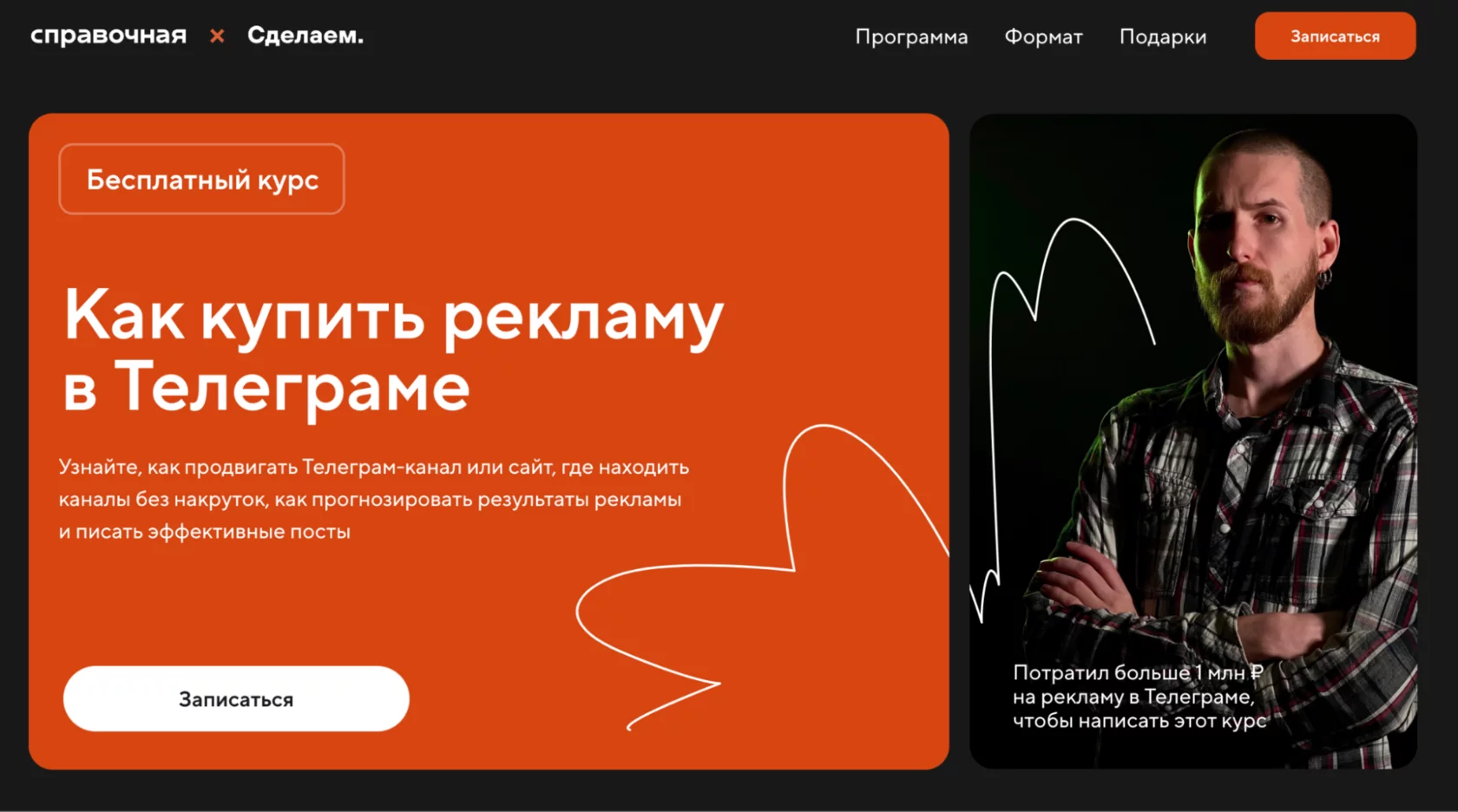 Ребята из Справочной уже готовили курс вместе со «Сделаем» в 2023 году. В нём Паша рассказал, как продвигать Телеграм-канал, как прогнозировать результаты рекламы и писать эффективные посты. Сам курс полностью бесплатный. Чтобы получить к нему доступ, нужно заполнить короткую анкету: указать номер телефона и почту.