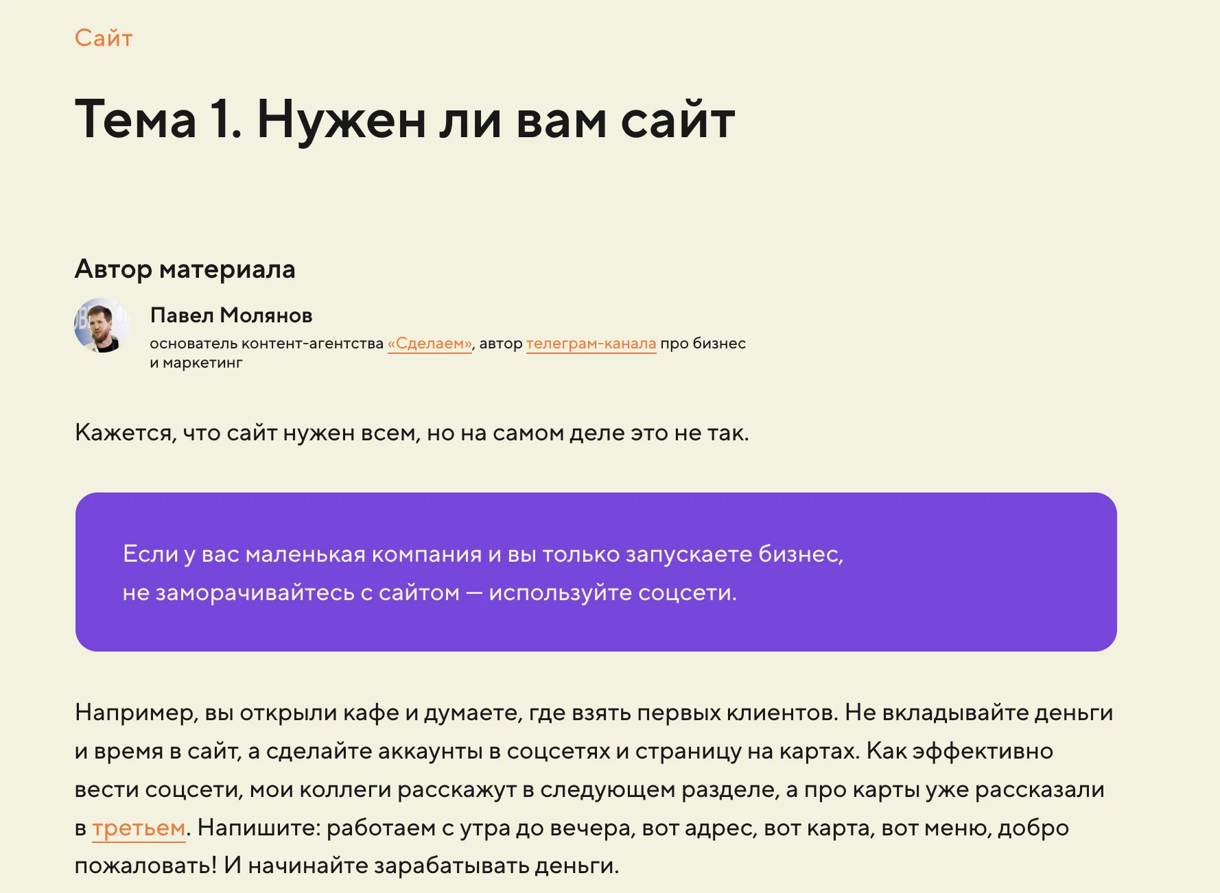 Мы погрузились в запрос, помогли найти экспертов, провели 6 интервью и создали крутой курс вместе со Справочной. Один урок сделал Паша Молянов, основатель агентства «Сделаем».