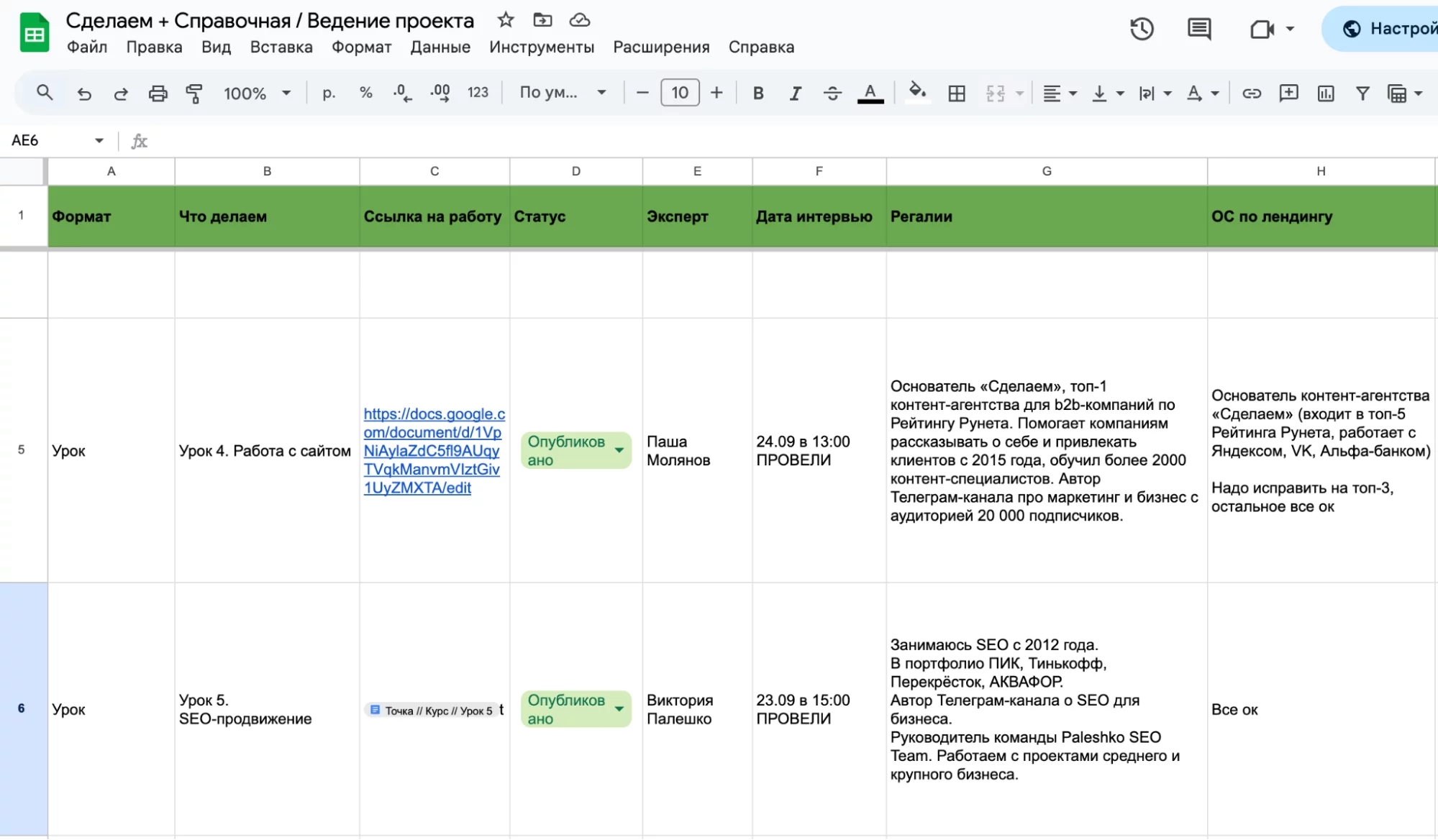 Все статусы фиксировали в дорожной карте проекта — чтобы клиент всегда был в курсе, что происходит с каждым уроком