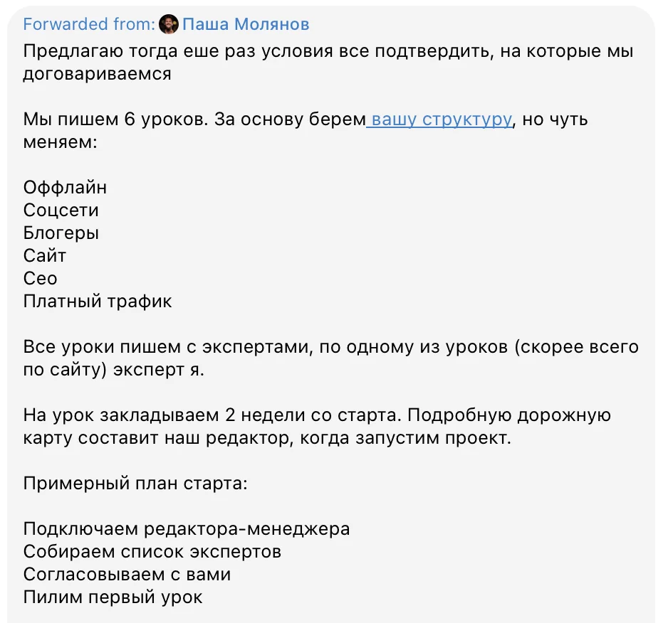 Паша Молянов забрал себе один из уроков — про продвижение сайта. Затем составил список из 30 экспертов, с которыми знаком лично, и предложил клиенту выбрать из них.