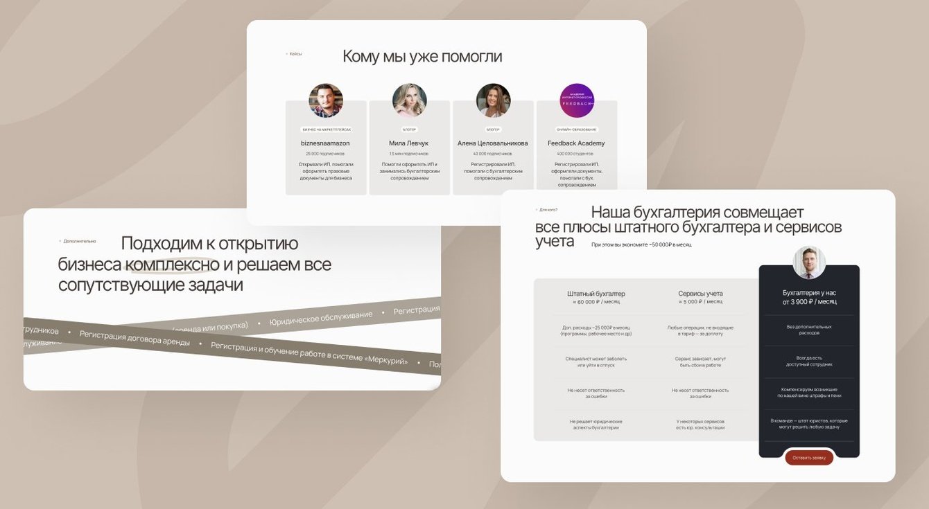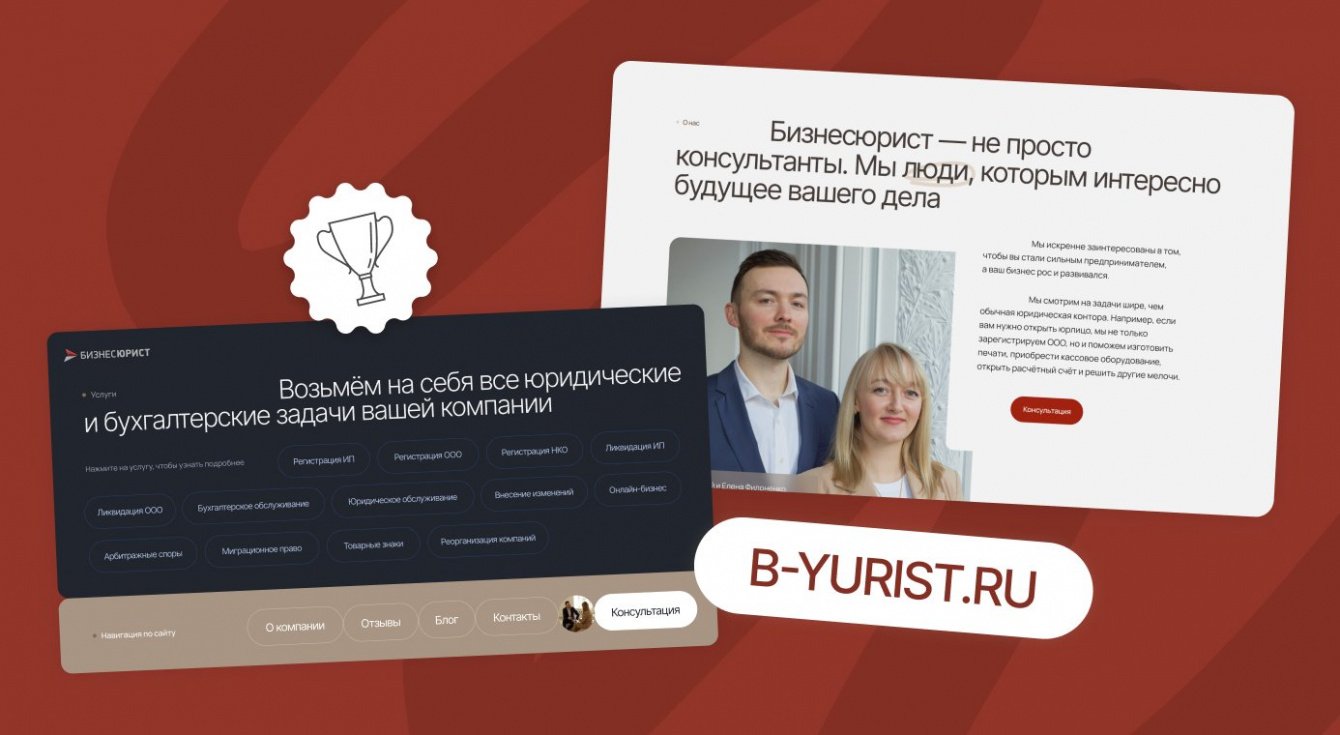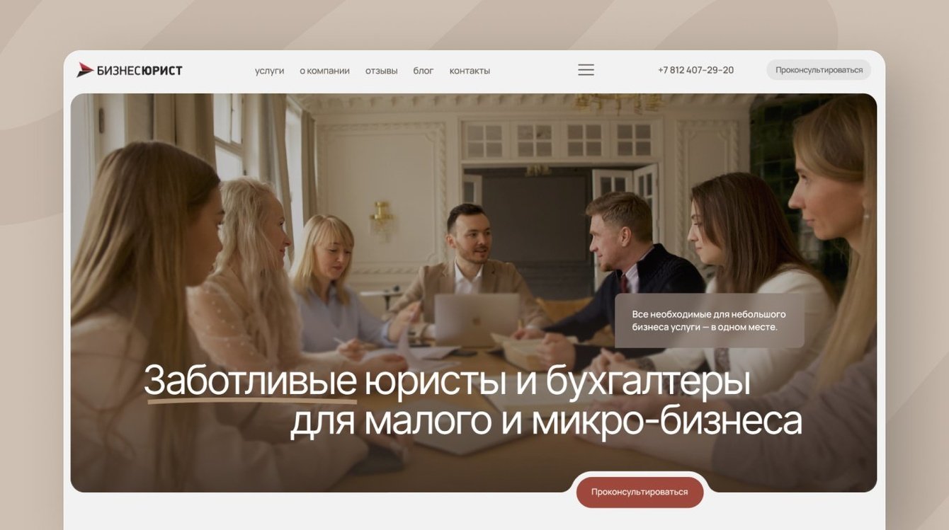 "Этот важный посыл мы уловили, когда общались с основателем «Бизнесюриста» Алексеем. На созвоне он классно описал подход их компании: «Понимаете, мы не те юристы, которые сидят за дубовым столом с дорогими золотыми ручками. У нас, вон, бухгалтер весь татуированный — нам важно через сайт показать, что мы в первую очередь живые люди, и хотим помогать молодым предпринимателям» — Елена Бобина, арт-директор проекта, CEO е-б эдженси.