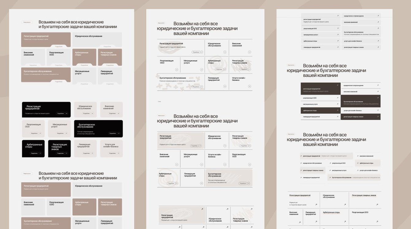 Блок услуг — один из ключевых на главной странице. Путь пользователя обычно такой: он не просто ищет «какого-то там юриста», ему важно быстро понять, что этот специалист разбирается конкретно в его проблеме. Поэтому нам нужно было акцентировать внимание на том, какие разные услуги оказывает «Бизнесюрист» — и прямо с главной перевести пользователя на нужную ему услугу, где он уже подробно все узнает и запишется на консультацию.