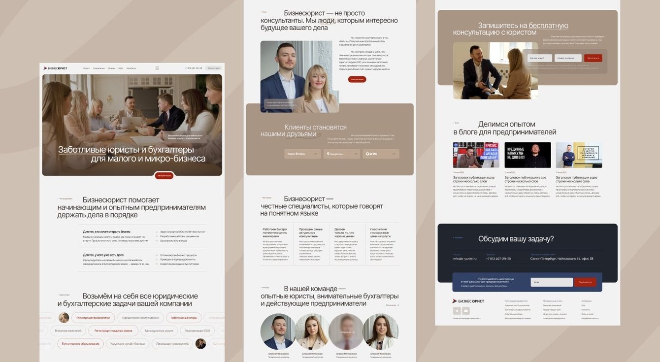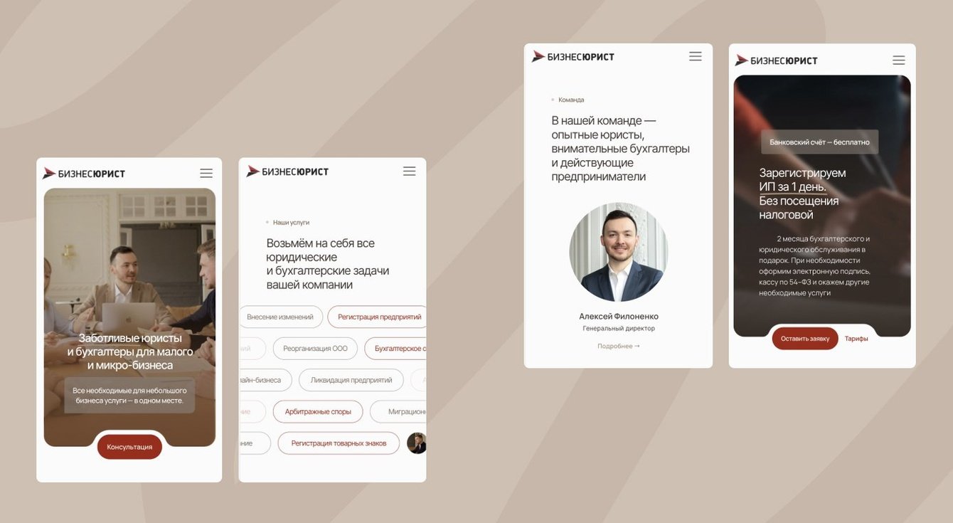 К нам обратился Алексей, основатель юридической компании «БИЗНЕСЮРИСТ». У компании был сайт, который Алексей сам собрал на конструкторе несколько лет назад — на 2022 год сайт морально устарел, не отображал все актуальные услуги компании и был недостаточно удобным для пользователя из-за своей структуры.