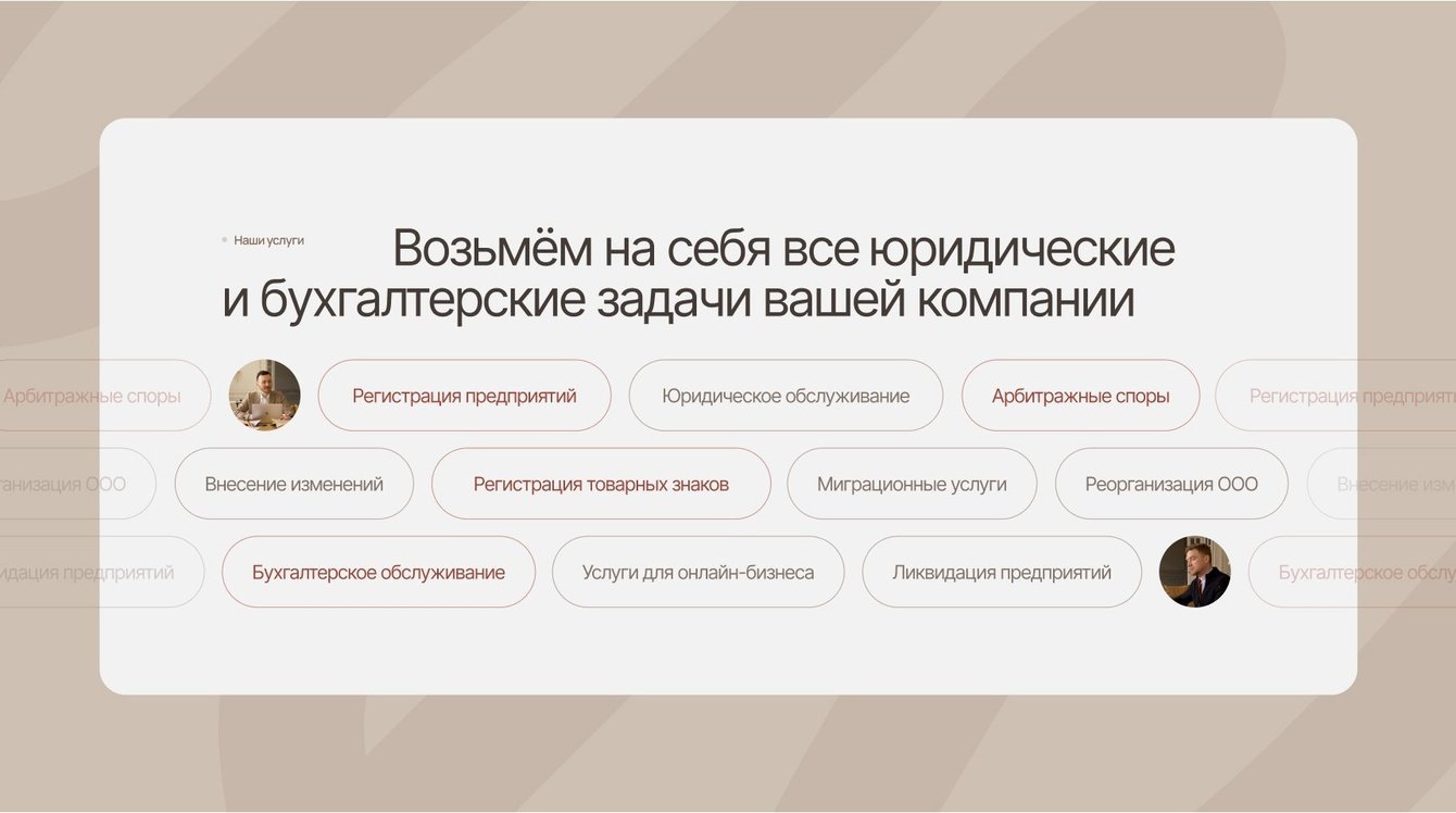 Финальное решение — оформить блок в виде набора кнопок, которые анимируются вместе со скроллом. Мы разбавляем их фотографиями членов команды, чтобы снова сделать акцент на том, что в «Бизнесюристе» вы работаете в людьми.