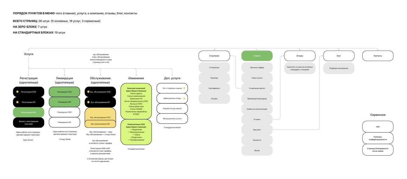 На старом сайте все услуги компании были перемешаны — например, чтобы попасть на страницу «Ликвидации ИП» нужно было сначала перейти на страницу «Ликвидация бизнеса», затем выбрать вид бизнеса, который вы хотите ликвидировать, и только потом попасть в нужный раздел.