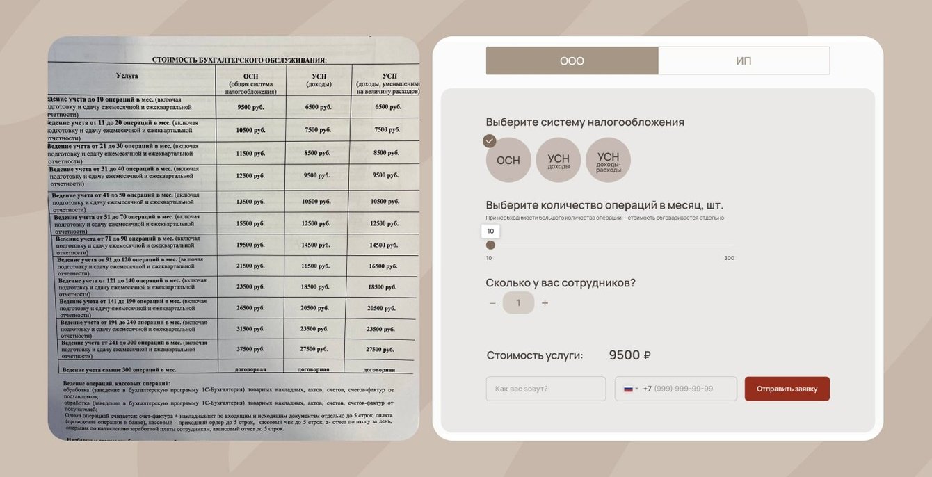 У «Бизнесюриста» гибкие тарифы на бухгалтерское сопровождение — стоимость ежемесячного обслуживания напрямую зависит от размера компании клиента. Чтобы не грузить пользователя сложной тарифной сеткой, мы внедрили и настроили простой калькулятор: достаточно выбрать вид юрлица, систему налогообложения и указать среднее количество операций в месяц.