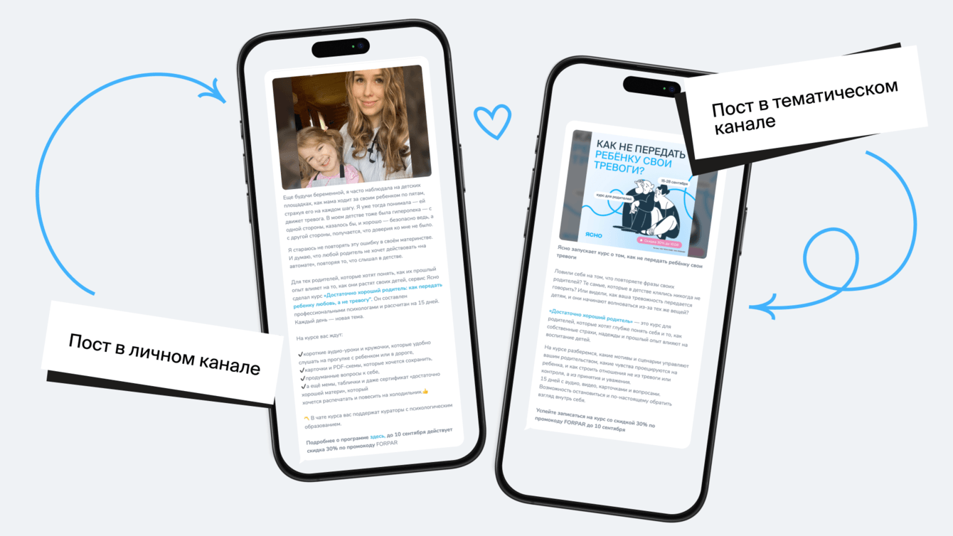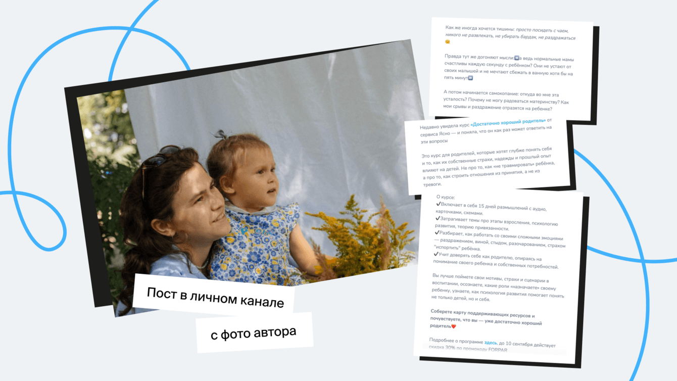 Для личных каналов написали нативный текст в стиле блогера. А чтобы усилить доверие, использовали личное фото автора с ее ребенком.