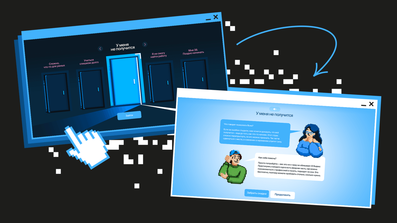 Ссылка в рекламе вела на лендинг, где нужно открывать двери со своими страхами, например: «Я не смогу найти работу» или «Мне 38. Поздно начинать». За дверью ты попадаешь на страницу, где психологи Ясно объясняют страх и как его преодолеть. А в конце — промокоды со скидками на сессию с психологом в Ясно и обучение в Яндекс Практикуме.
