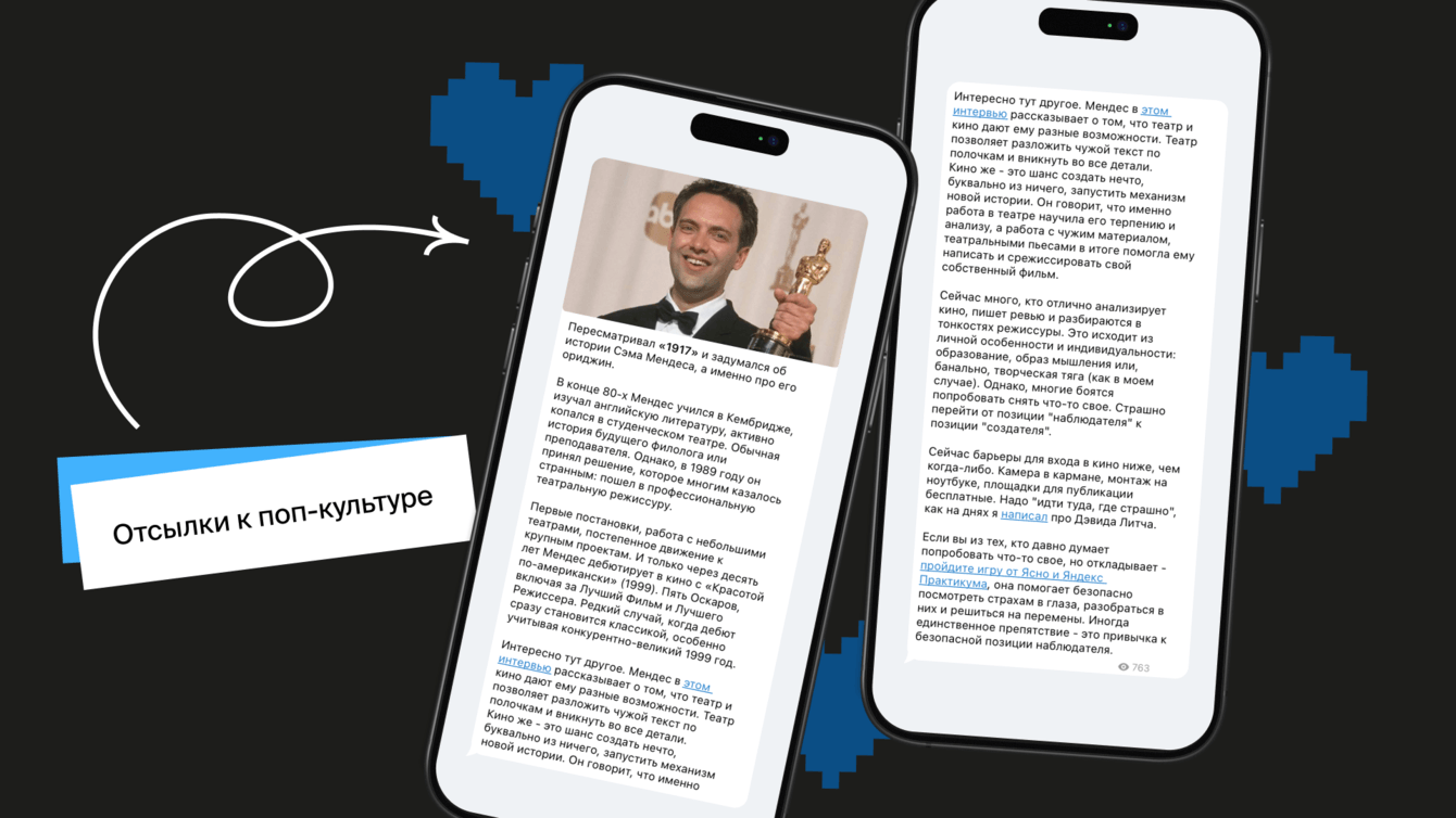 Мы подавали тему смены профессии через отсылки к поп-культуре и хобби, чтобы рассказ звучал искренне и по-настоящему близко.