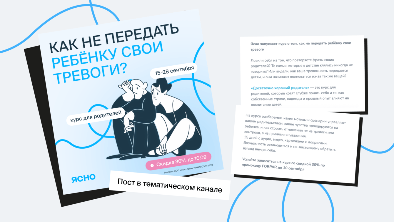Второй наш проект с посевами в телеграм-каналах для Ясно — реклама продукта «Достаточно хороший родитель». Это курс для родителей, которые хотят разобраться, как их собственные страхи, надежды и прошлый опыт влияют на отношения с детьми.