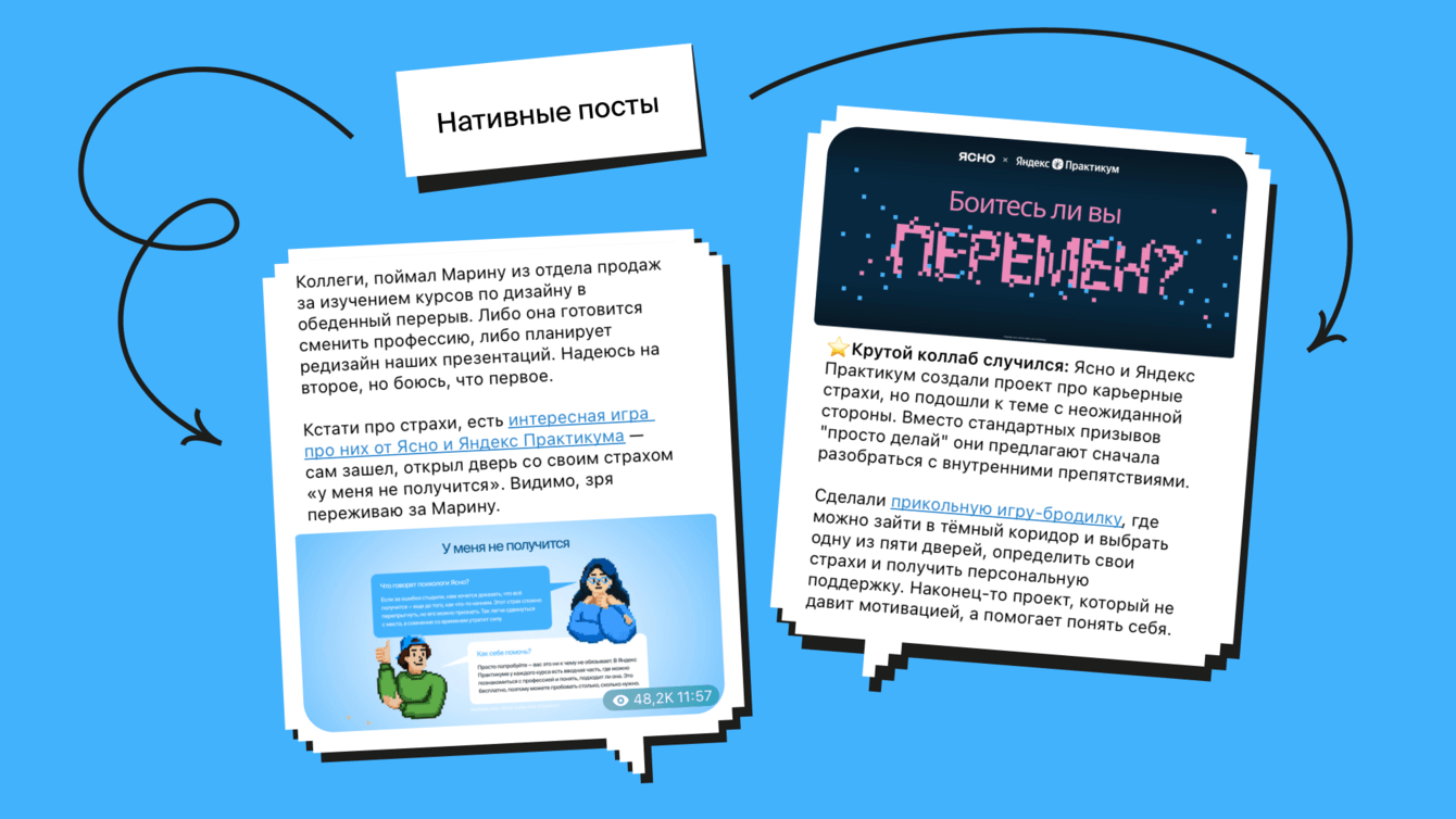 Опыт с двумя кампаниями для Ясно показал, что посевы в Telegram критически важно адаптировать под аудиторию конкретного канала. Пост, который органично смотрится в личном блоге, не подойдёт для новостного или тематического формата.