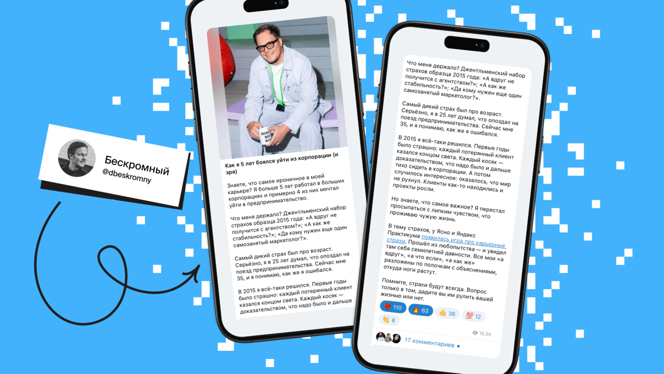 Например, автор канала «Бескромный» поделился, как пять лет боялся уйти из корпорации на фриланс из-за страха, что ничего не получится. Аудитория это оценила. Люди писали в комментариях, что блогер затронул больную тему.