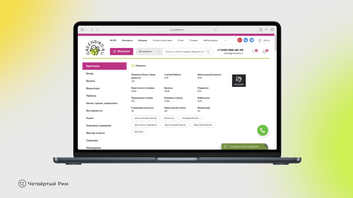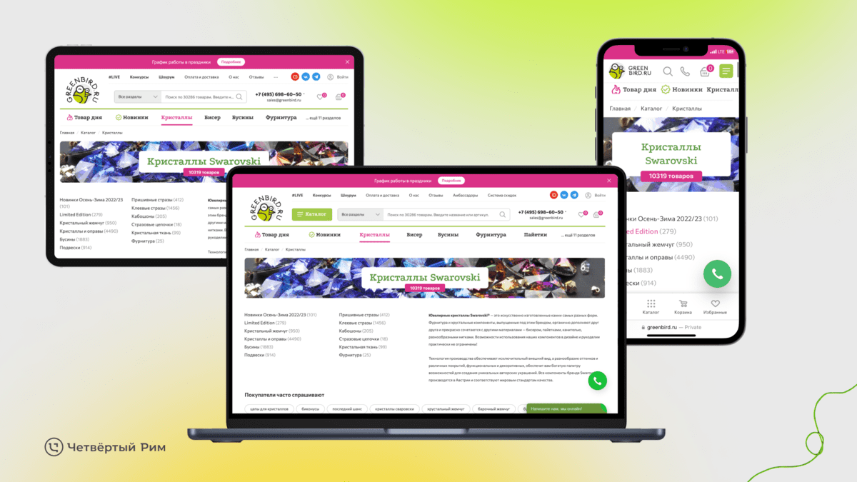 В итоге получили сайт, которым удобно пользоваться как рукодельницам, делающим покупки, так и менеджерам, которые обрабатывают заказы. И, самое главное, мы смогли сохранить узнаваемость сайта GreenBird, чтобы старые клиенты всегда могли опознать любимый магазин, который работает уже более 15 лет.