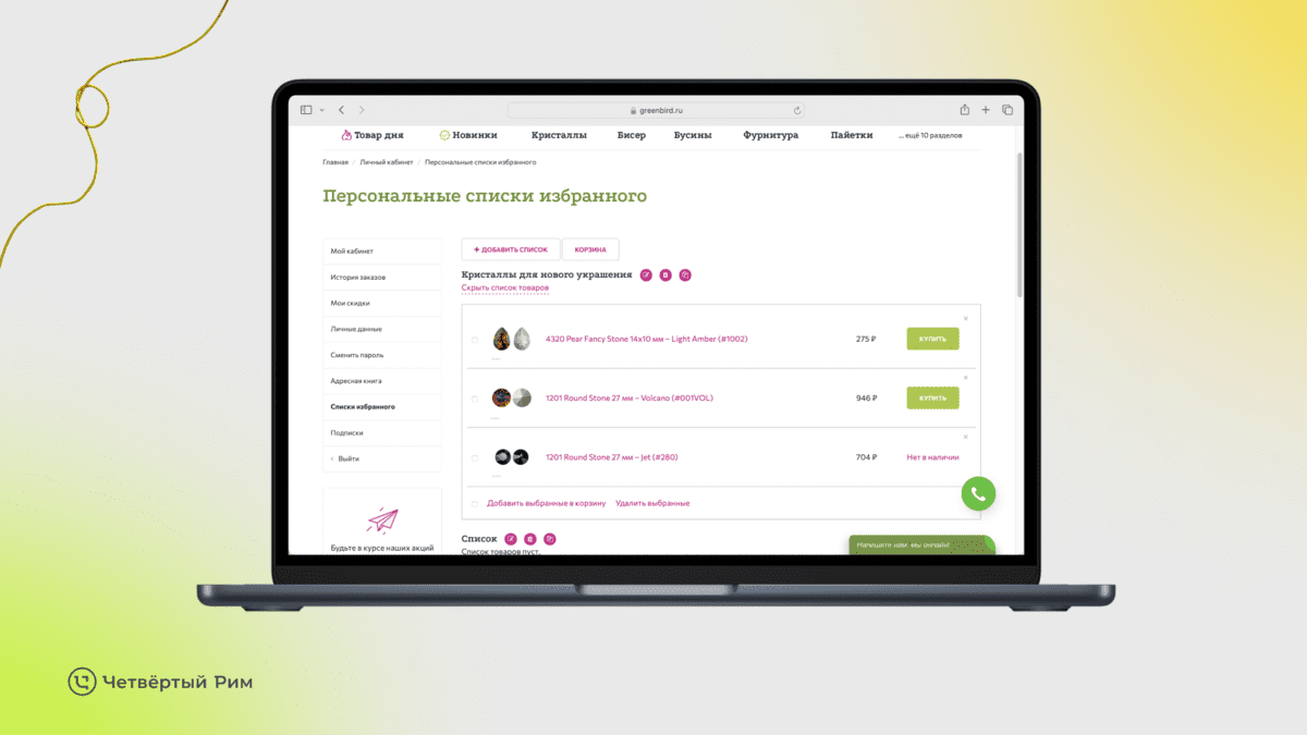 Сейчас почти во всех сервисах есть раздел с понравившимися товарами. Особенность этого функционала для GreenBird в том, что пользователи могут не только лайкнуть товар и добавить его в один список, но и создавать несколько персональных списков. Например, мастерицам бывает удобно собрать в один список бусины и леску для новой подвески, а в другой — кристаллы, оправы и кусачки для создания сережек.