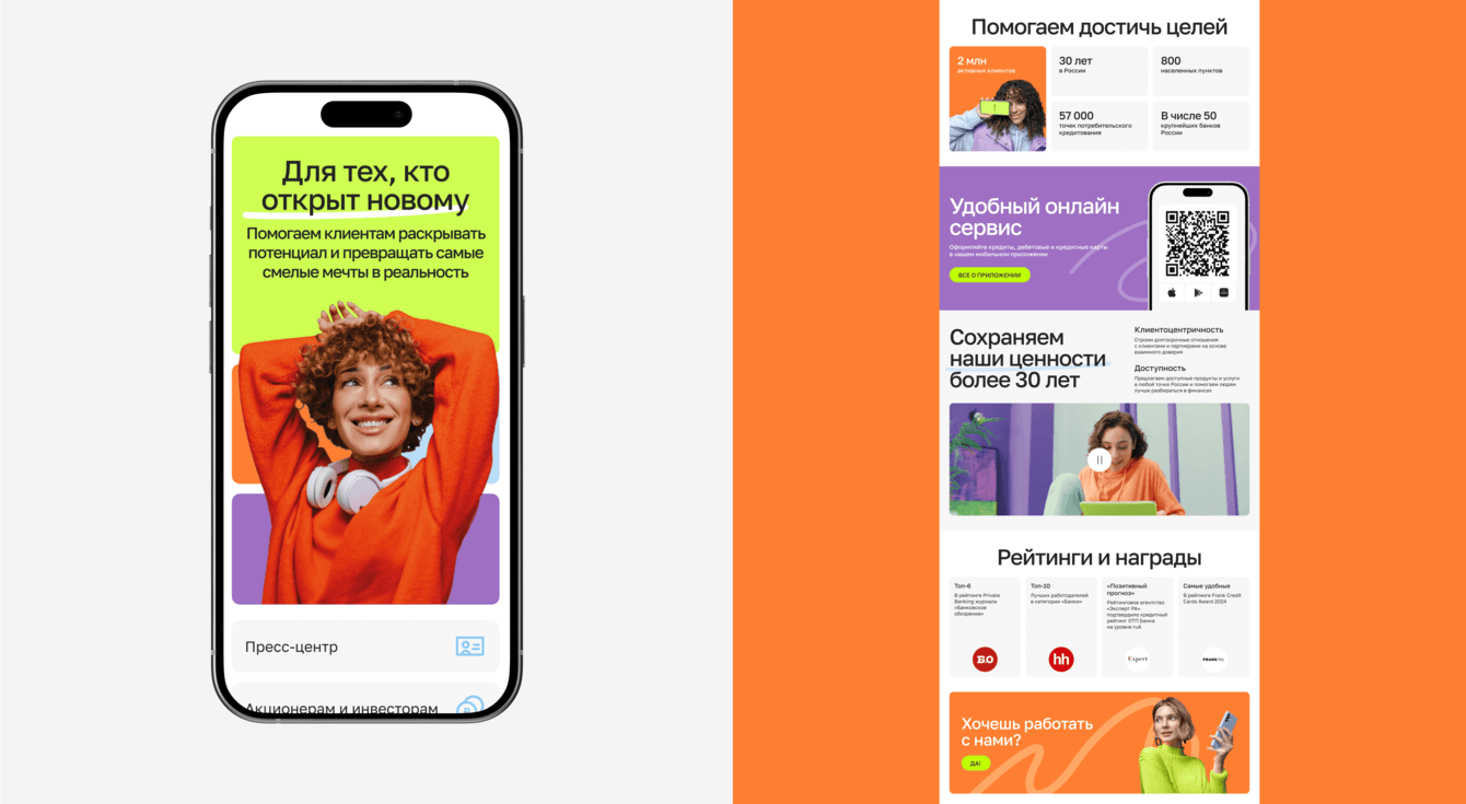 Страницу о банке, как ключевую из непродуктовых страницу сайта, сделали в полном соответствии с новой концепцией: нетипичной, решительной, эмоциональной и прямолинейной. Она объединила в себе представительскую, HR и презентационную функции, став единым хабом важной информации о банке.