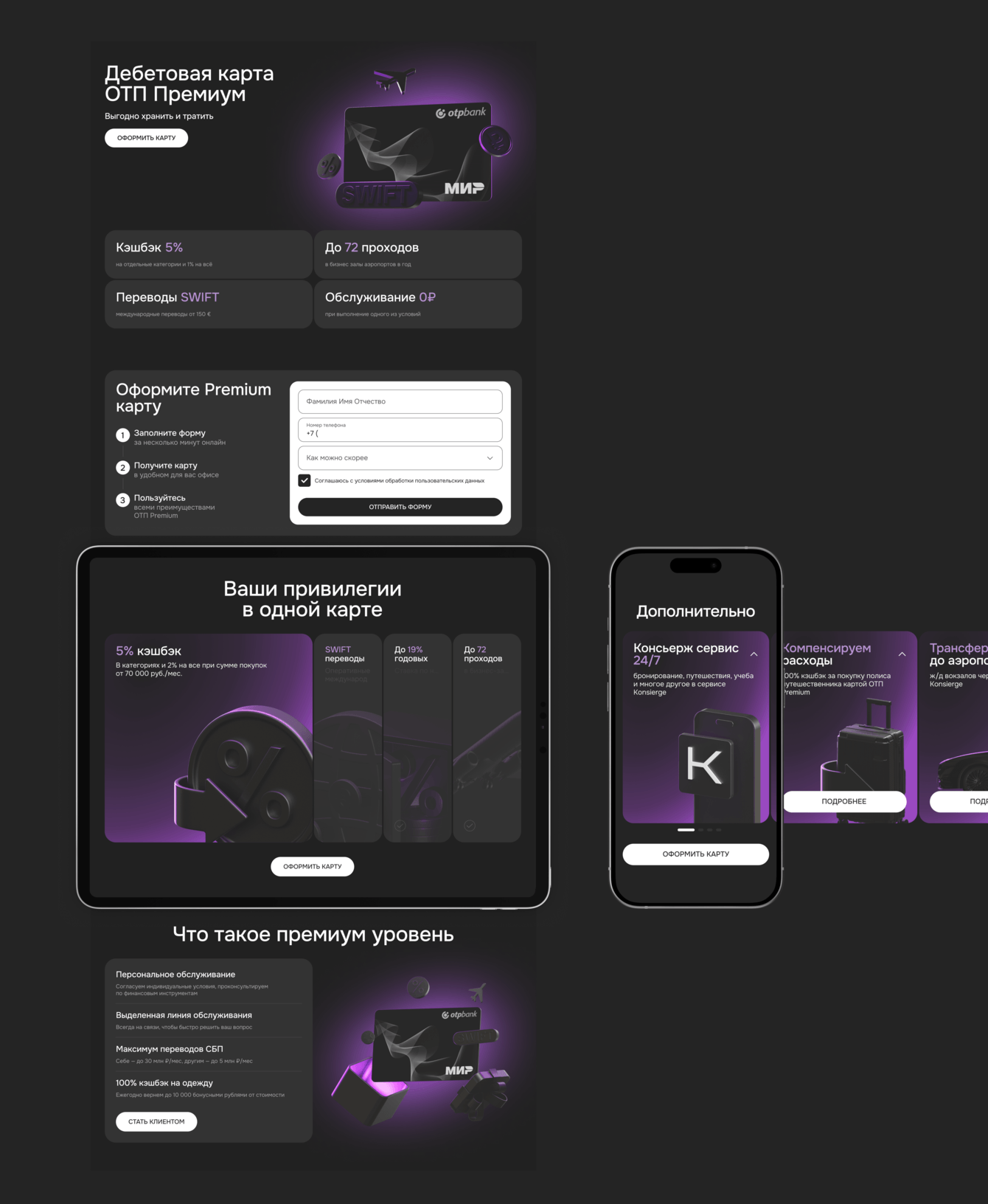 Для раздела Premium создали отдельный визуальный стиль в сдержанных премиальных тонах. Главные сообщения раздела — «Эксклюзивные возможности» и «Максимальная выгода» — подчеркнули с помощью стильных анимаций и 3D-визуализаций.