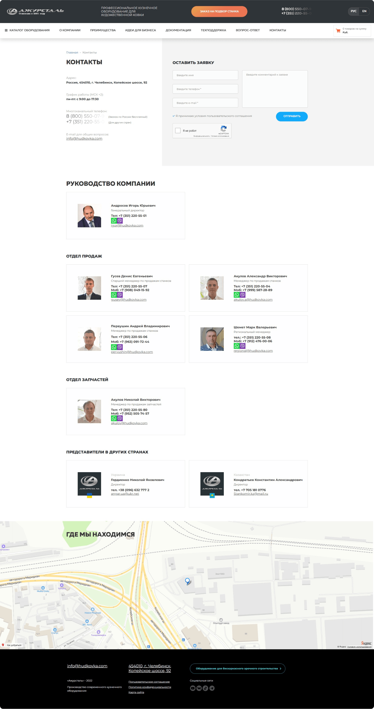 На странице контактов добавили карту, представителей в других странах, фотографии и данные для связи с контактными лицами.