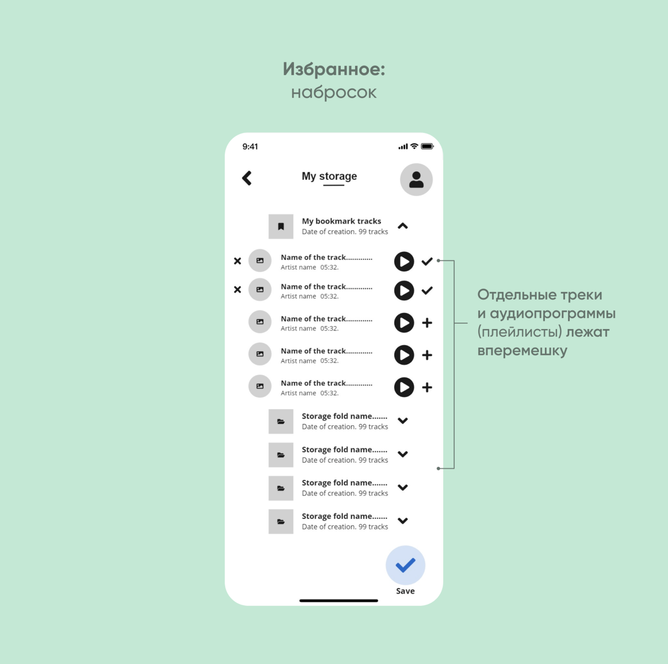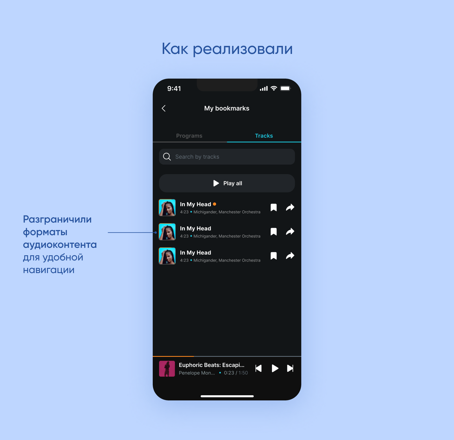 Мы разграничили сохраненное по двум типам — аудиопрограммы (плейлисты) и отдельные записи. Так пользователь не запутается и точно найдет, что ему нужно.