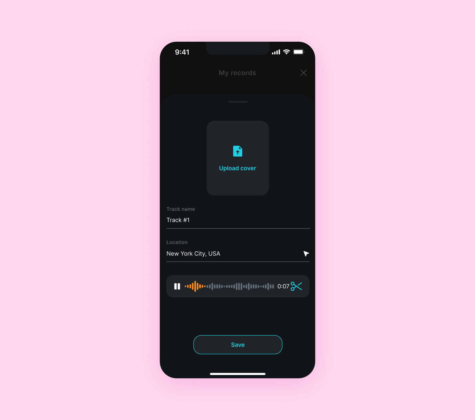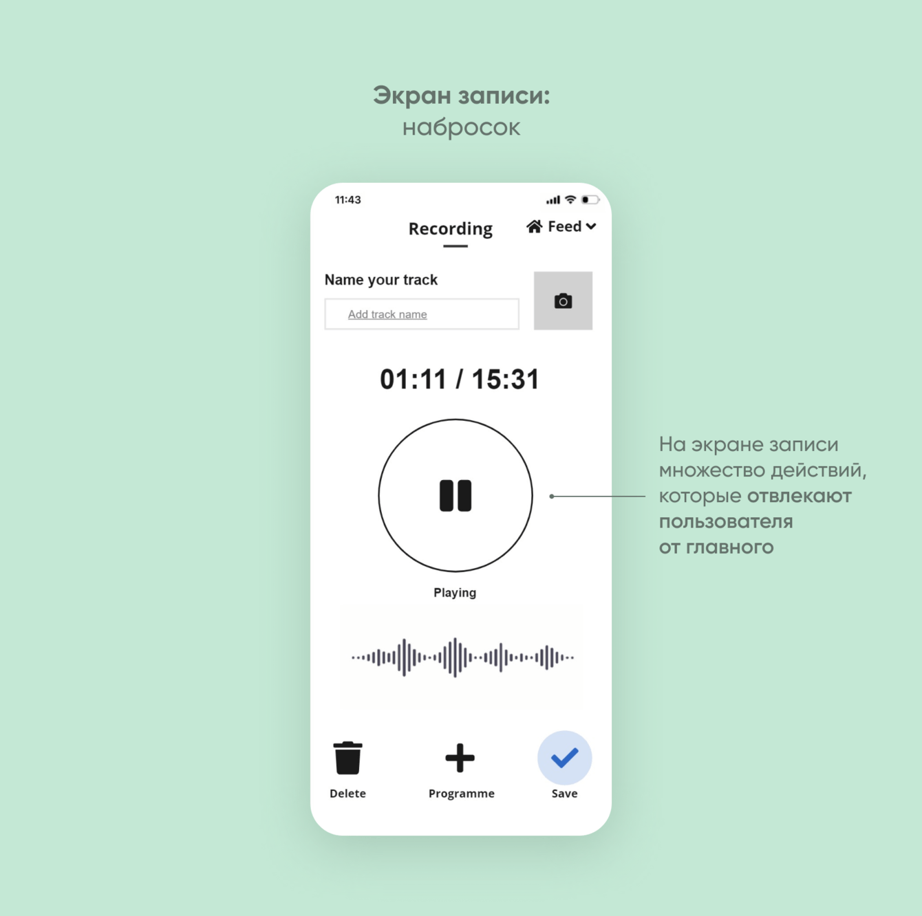 В наброске в разделе запись очень много действий: пользователю предлагается тут же придумать название трека и загрузить обложку, удалить или сохранить запись. Все это может отвлекать от непосредственно записи.