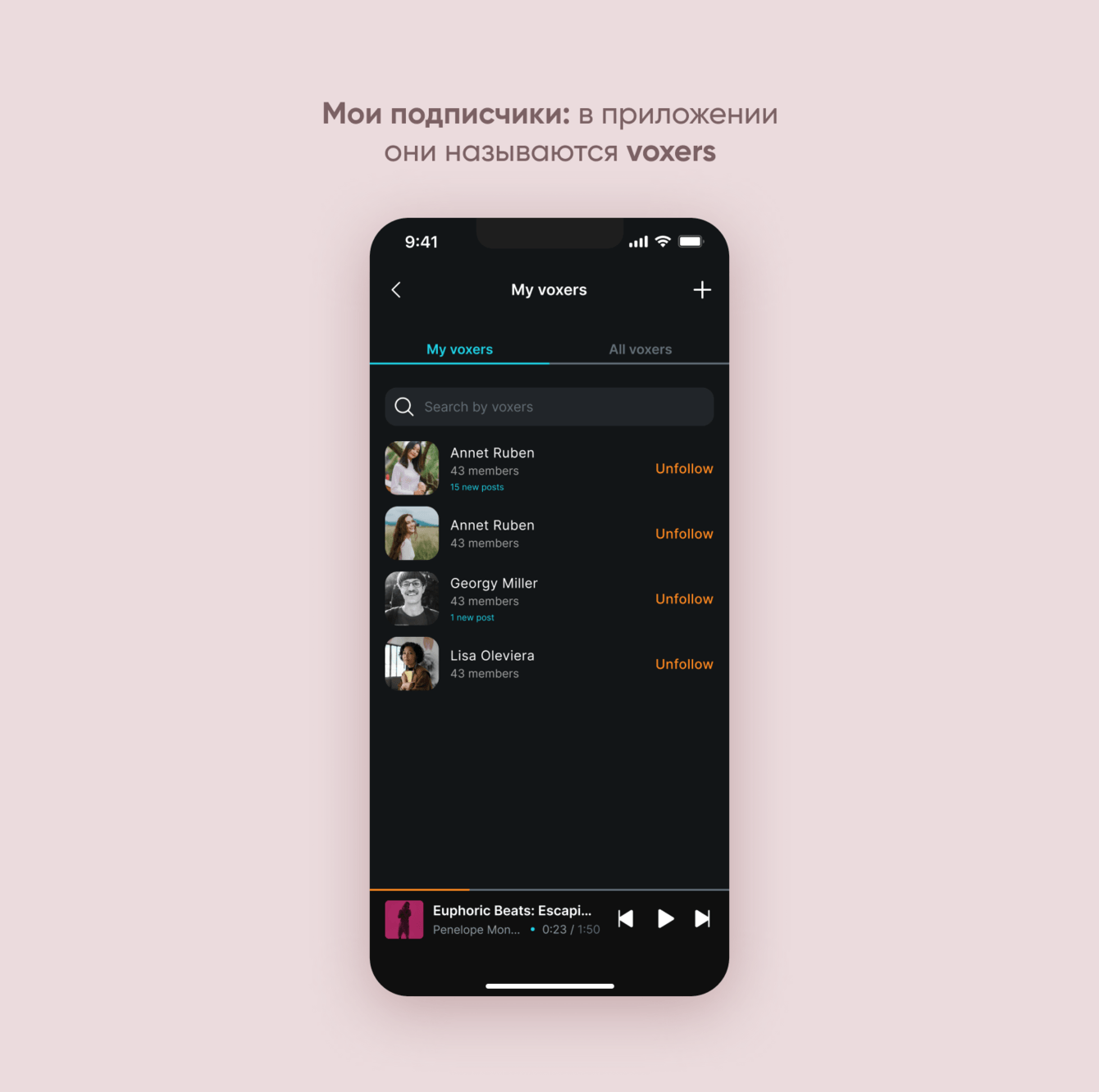 Пользователь может собрать свою аудиопрограмму из любого контента, доступного в voxtox, и поделиться ей с другими. А еще под каждым плейлистом можно оставлять комментарии, в том числе голосовые. По задумке создателей приложения, это мотивирует людей строить коммьюнити вокруг звука.