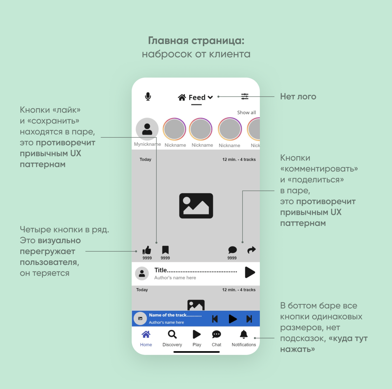 В наброске от клиента кнопки «лайк» и «сохранить», «комментировать» и «поделиться» находились в паре, но такое размещение противоречит привычным UX паттернам. К тому же все кнопки выстроились в один ряд. Это визуально перегружает пользователя, он теряется и не понимает, какое действие ему нужно совершить.