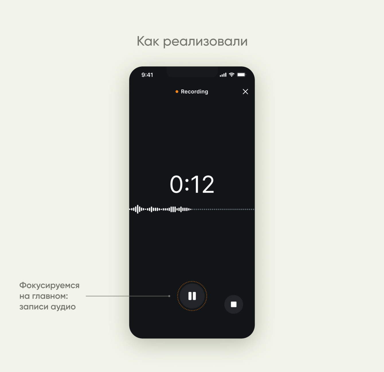 Мы решили сфокусироваться на главном: во время записи предлагаем только или поставить на паузу, или завершить запись. Для последующих действий есть отдельные экраны.