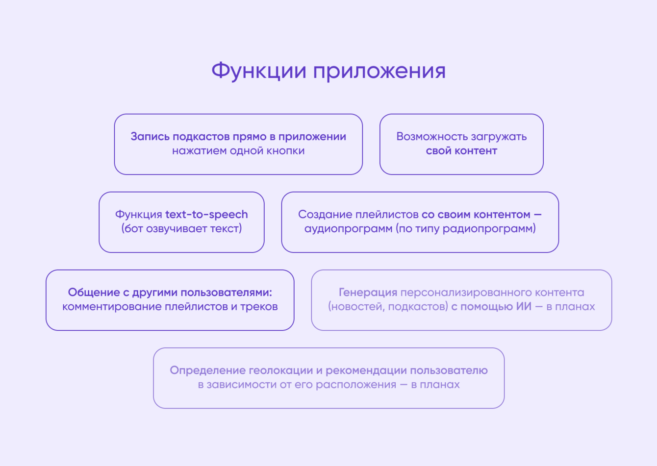 Концепция продукта — современное, персонализированное радио с элементами соцсети, которое дает возможность как потреблять контент, так и создавать его прямо в приложении. Например, записывать голосовые сообщения и подкасты. Весь контент максимально точно соответствует предпочтениям пользователя: даже реклама подбирается с учетом его интересов.