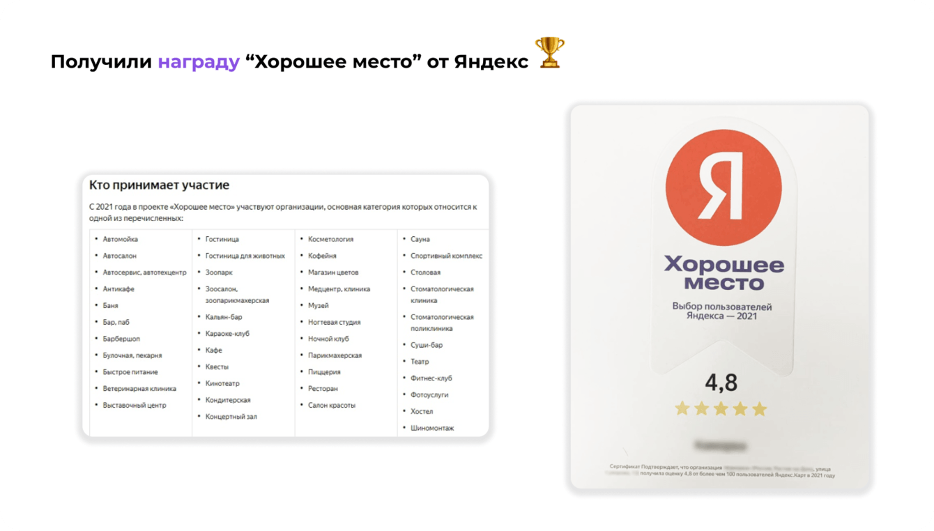 Кратко о «Хорошем месте»: каждый год Яндекс Бизнес вручает награду компаниям с высокими рейтингам по отзывам и оценкам пользователей. На почту руководителя приходит награда - табличка «Хорошее место», которую можно повесить на дверь заведения.