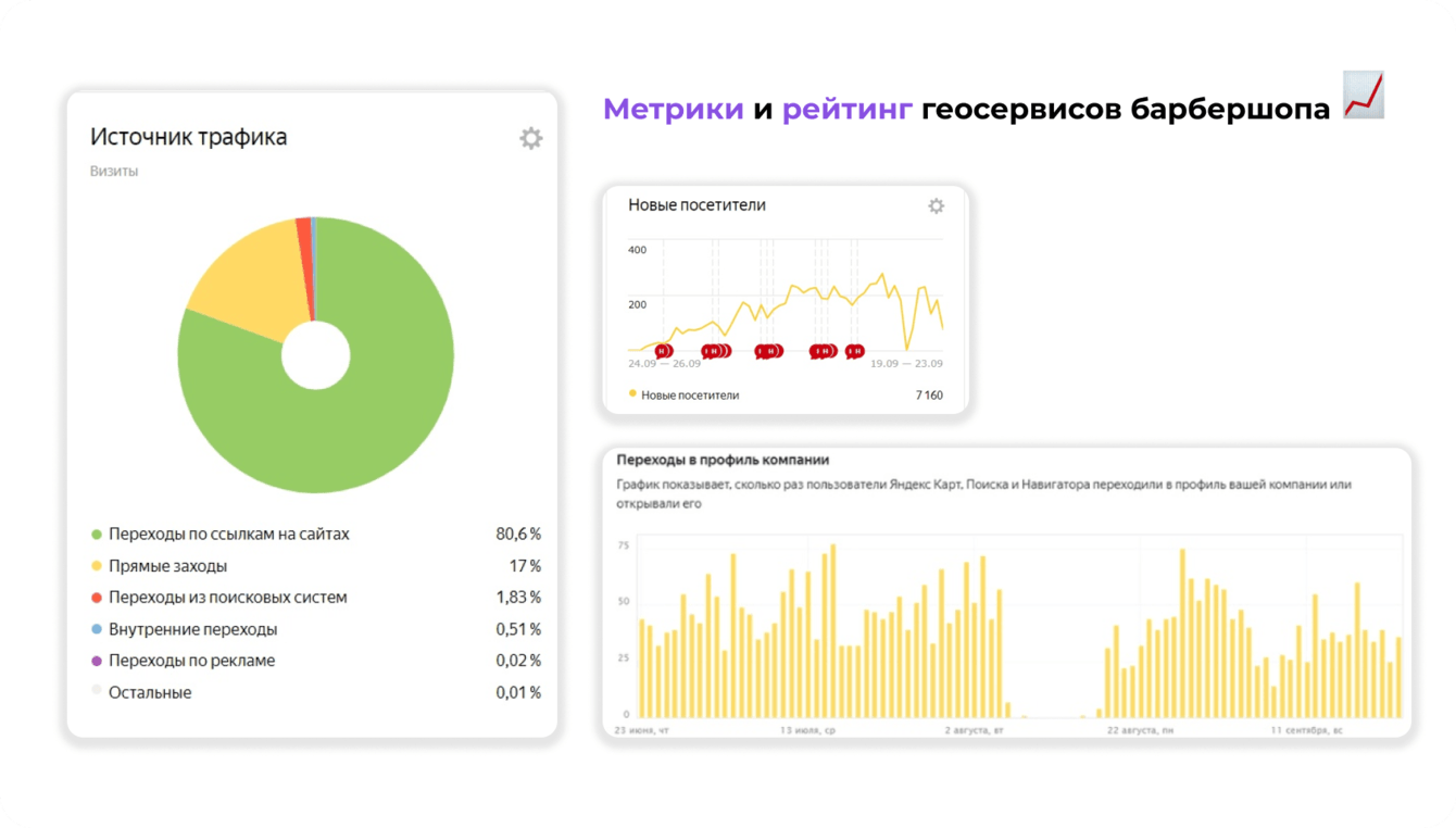Мы предусмотрели появление негатива и плохие сценарии, но применять контрмеры не пришлось. Искусственно созданный рейтинг карточек поддерживался естественном образом: наши отзывы стимулировали клиентов оставлять настоящие. К счастью — положительные. Барбершоп рос в рейтинге компаний и мог претендовать на награду «Хорошее место» от Яндекса.