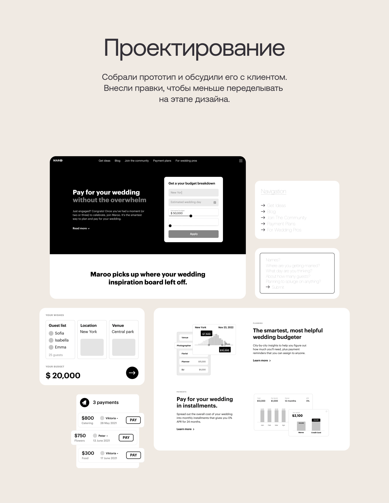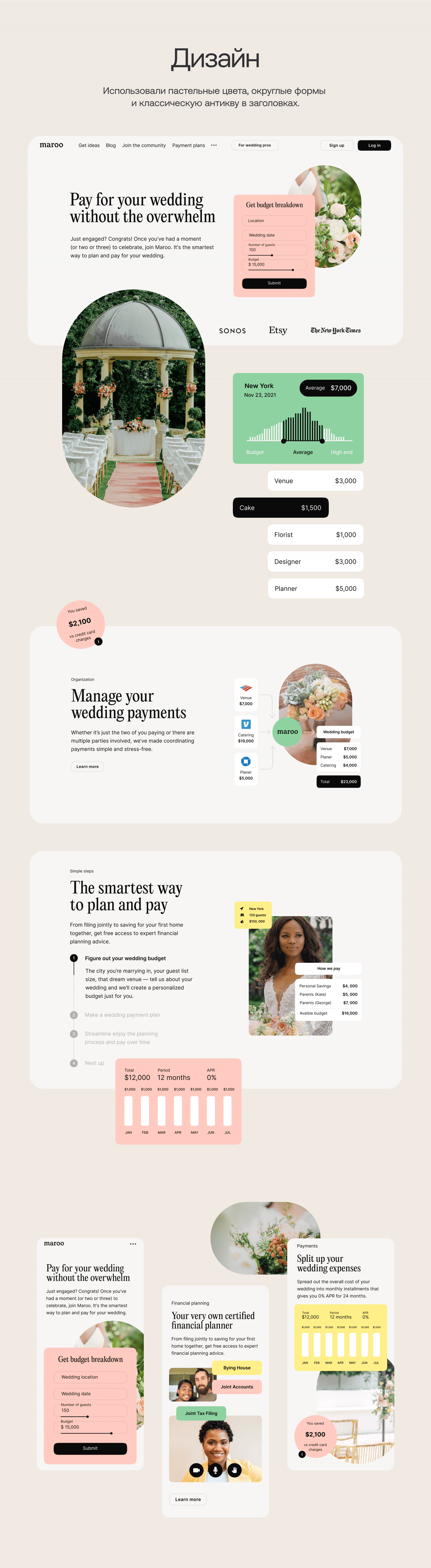 Maroo — сервис планирования и оплаты свадеб в рассрочку. Помогает найти нужных специалистов, прикинуть бюджет, не забыть, кто, когда и сколько платит. Компания поддерживает малый и средний бизнес, который обслуживает свадебную индустрию.