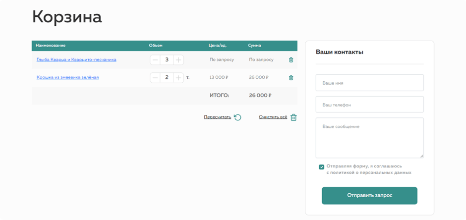 Поэтому в карточках товаров указан разный формат цен. Ситуация осложняется тем, что цена зависит от объема. Например, до 5 тонн — одна цена, от 5 до 10 — другая, от 10 — третья. Чтобы корзина работала корректно, мы написали несколько дополнительных скриптов.