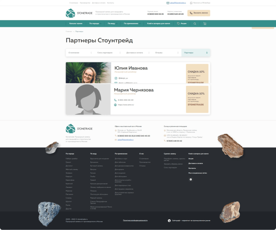 Добавили раздел «О компании» — «Партнёры» и разместили контакты дизайнеров-партнёров со скидкой на их услуги.