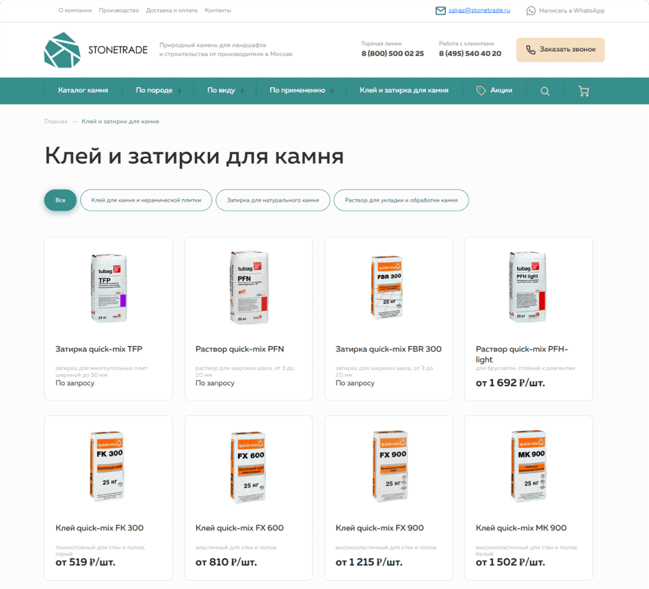 Добавили страницу с клеем и затиркой для камня, чтобы покупатель имел возможность заказать всё в одном месте и не искать по разным сайтам.