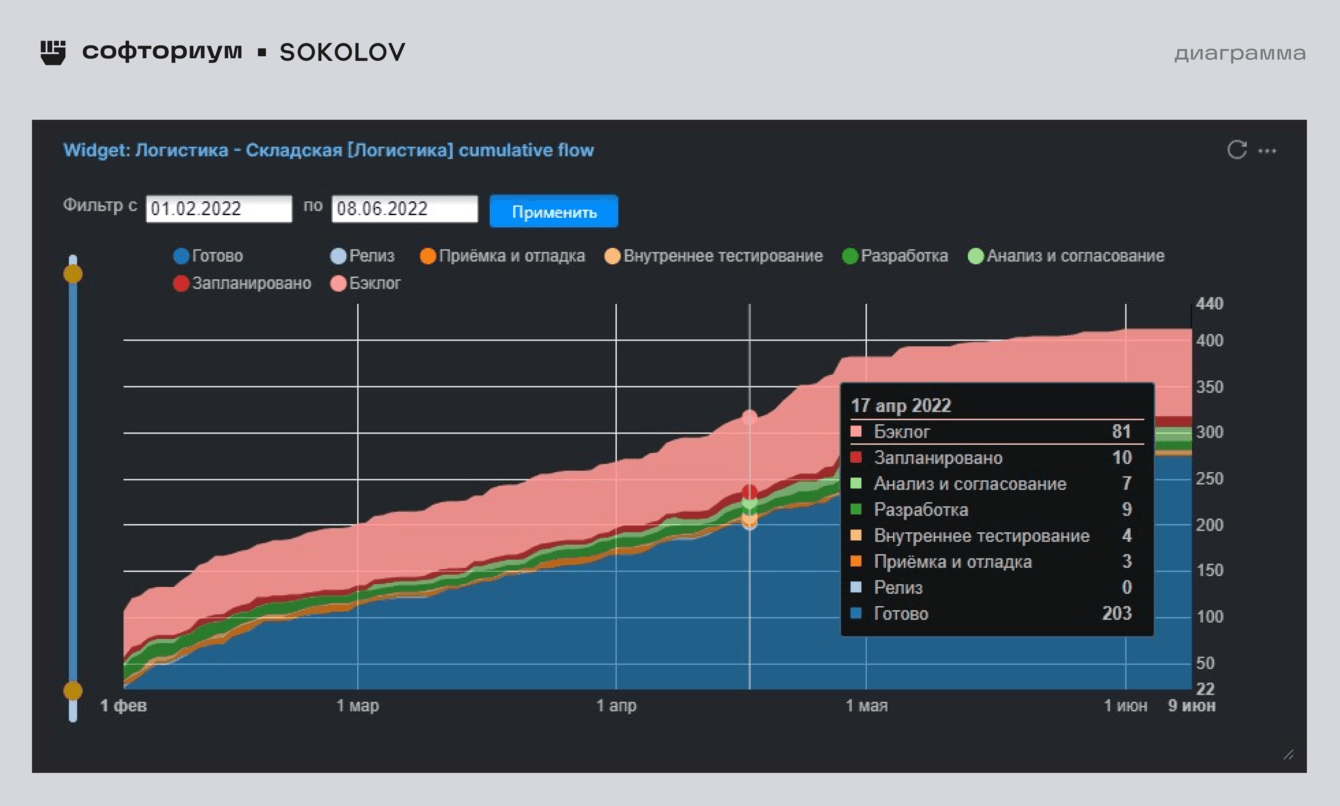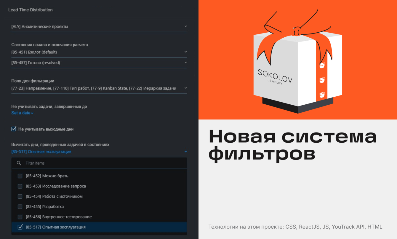 Sokolov хотел, чтобы мы усовершенствовали диаграммы, которые были в YouTrack: добавили виджеты с настраиваемой визуализацией и кастомной системой фильтров, чтобы отображение большого массива данных стало наглядным.