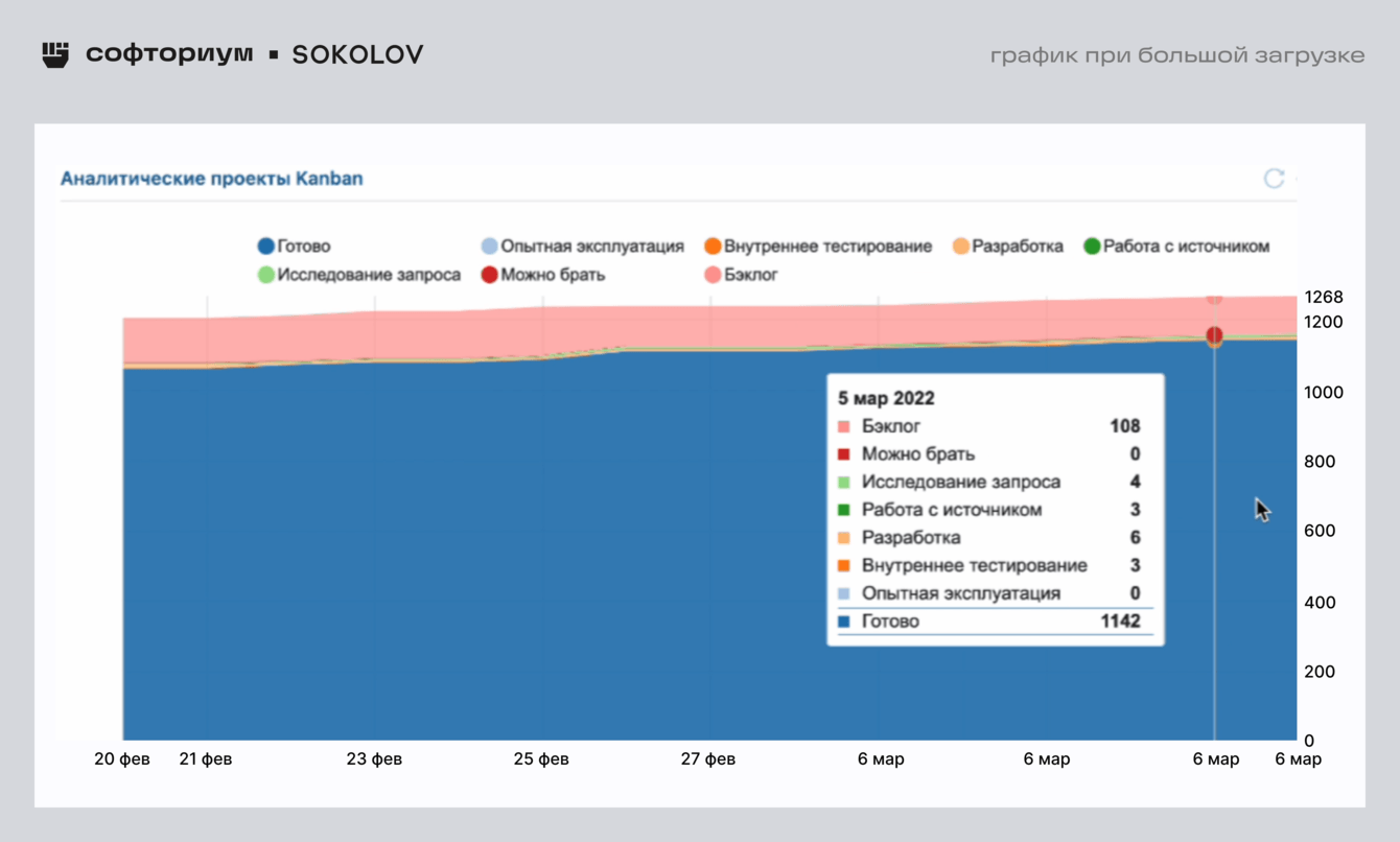 Вроде всё наглядно: ось х — даты, ось y — количество задач. Видно, какие задачи в прогрессе, какие в тесте. Но что произойдёт, если попытаться отследить статус не 147 задач, а, скажем, 1268? Наглядность покинет чат: