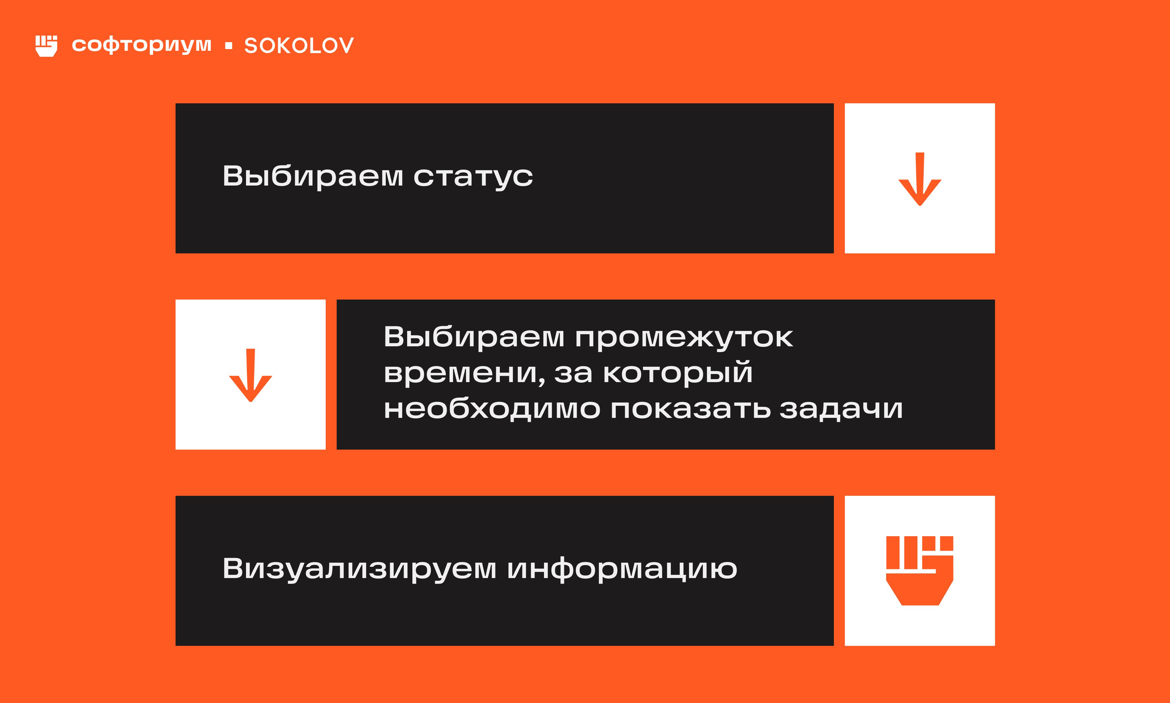 Клиенту важно было видеть, сколько времени задача находится в конкретном статусе. У YouTrack есть отображение событий как таковых: изменение статуса задачи, изменение комментариев, изменения параметров. Но нет распределения по периодам, то есть нет возможности собирать данные о дате вхождения задачи в определённый статус и о выходной точке.