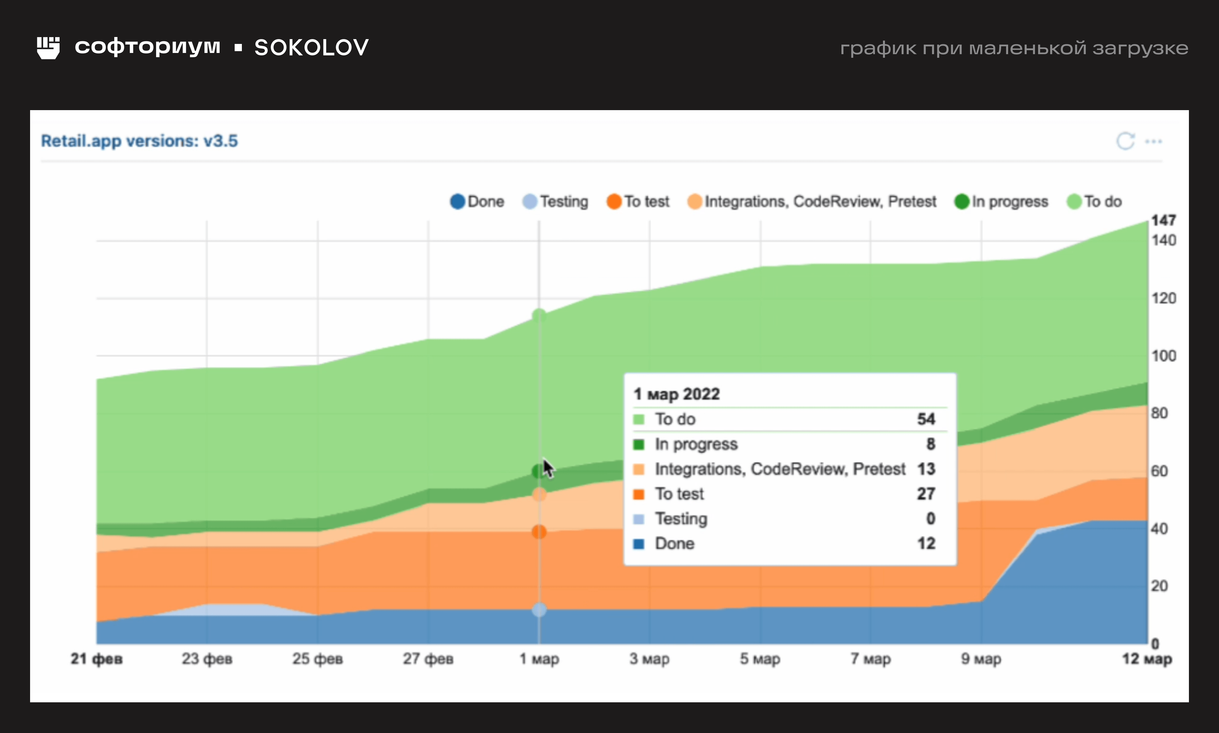 Вроде всё наглядно: ось х — даты, ось y — количество задач. Видно, какие задачи в прогрессе, какие в тесте. Но что произойдёт, если попытаться отследить статус не 147 задач, а, скажем, 1268? Наглядность покинет чат:
