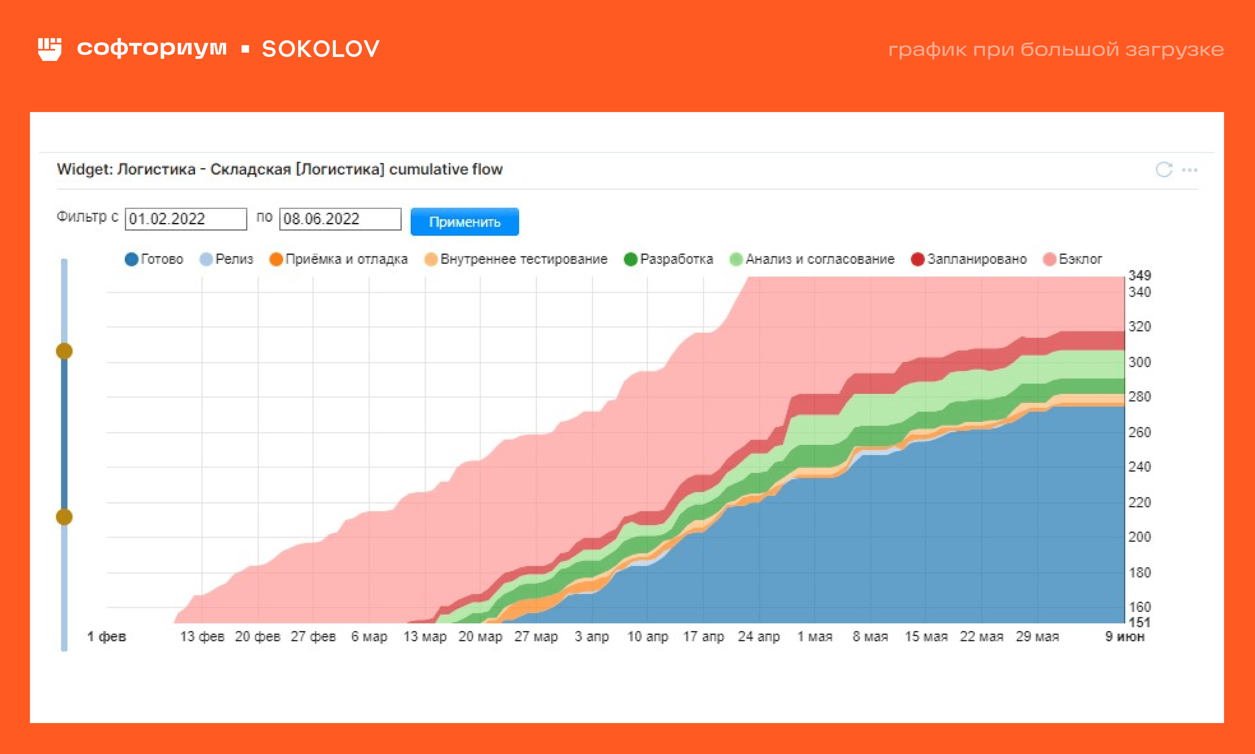 Клиент показал нам интерфейс виджета, в котором было всё, чего ему не хватало в YouTrack. Эта та же самая кумулятивная диаграмма, но уже с нужными функциями: