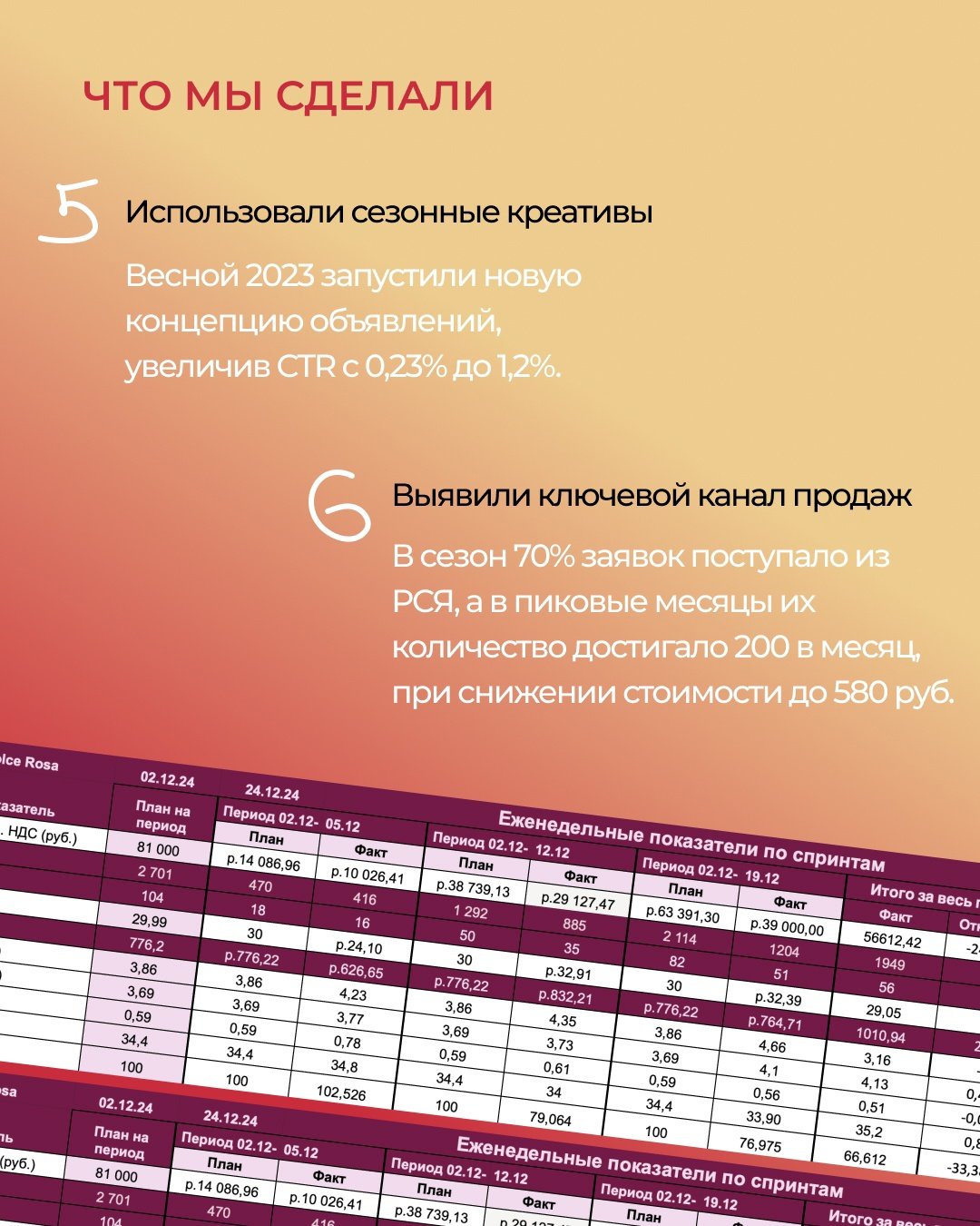 Весной 2023 запустили новую концепцию объявлений, увеличив CTR с 0,23% до 1,2%. Заявки начали активно приходить из РСЯ, снижая стоимость привлечения.