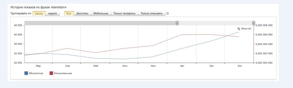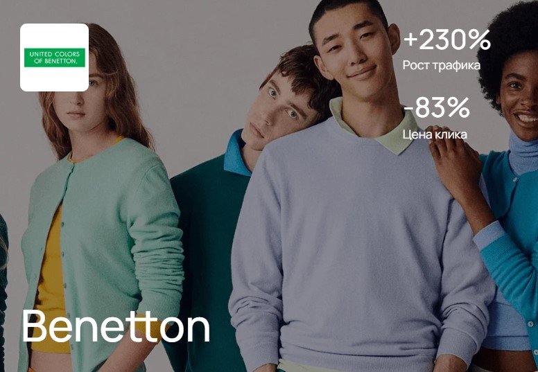По брендовым запросам сайт ru.benetton.com находится на первом месте в органической выдаче. Однако в рекламной выдаче первые места занимают Lamoda, Wildberries и Butik.ru. Конкурентные площадки забирают большую долю брендового трафика и продаж. Для увеличения дохода официальный сайт бренда принял решение размещаться на первых местах в рекламном блоке.