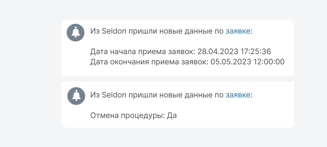 Все изменения по тендерной заявке со стороны Seldon автоматически приходят в карточку Битрикс24 и уведомлением менеджеру.