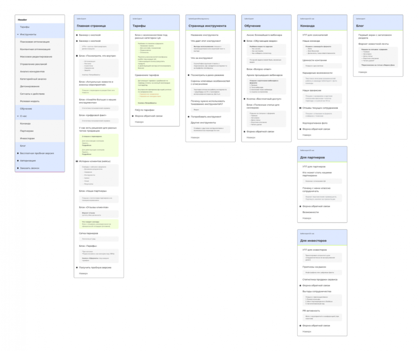Листая главную страницу, пользователь знакомится с сервисом, его УТП, преимуществами и тарифами. Чтобы подробно раскрыть возможности всех инструментов, мы сделали страницы для каждого из них. Отдельный раздел в структуре посвящен инвесторам, так как компания заинтересована в привлечении инвестиций для развития и расширения веб-продукта.