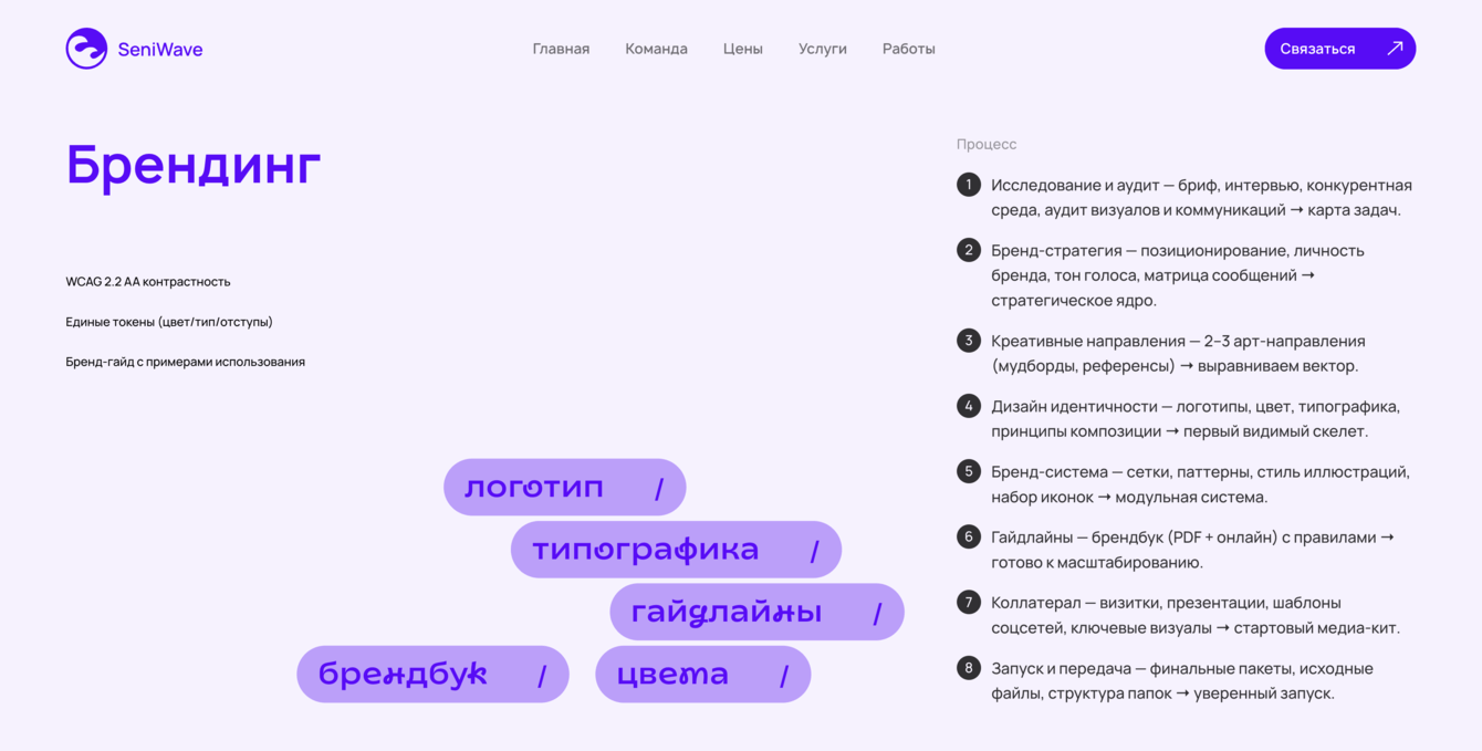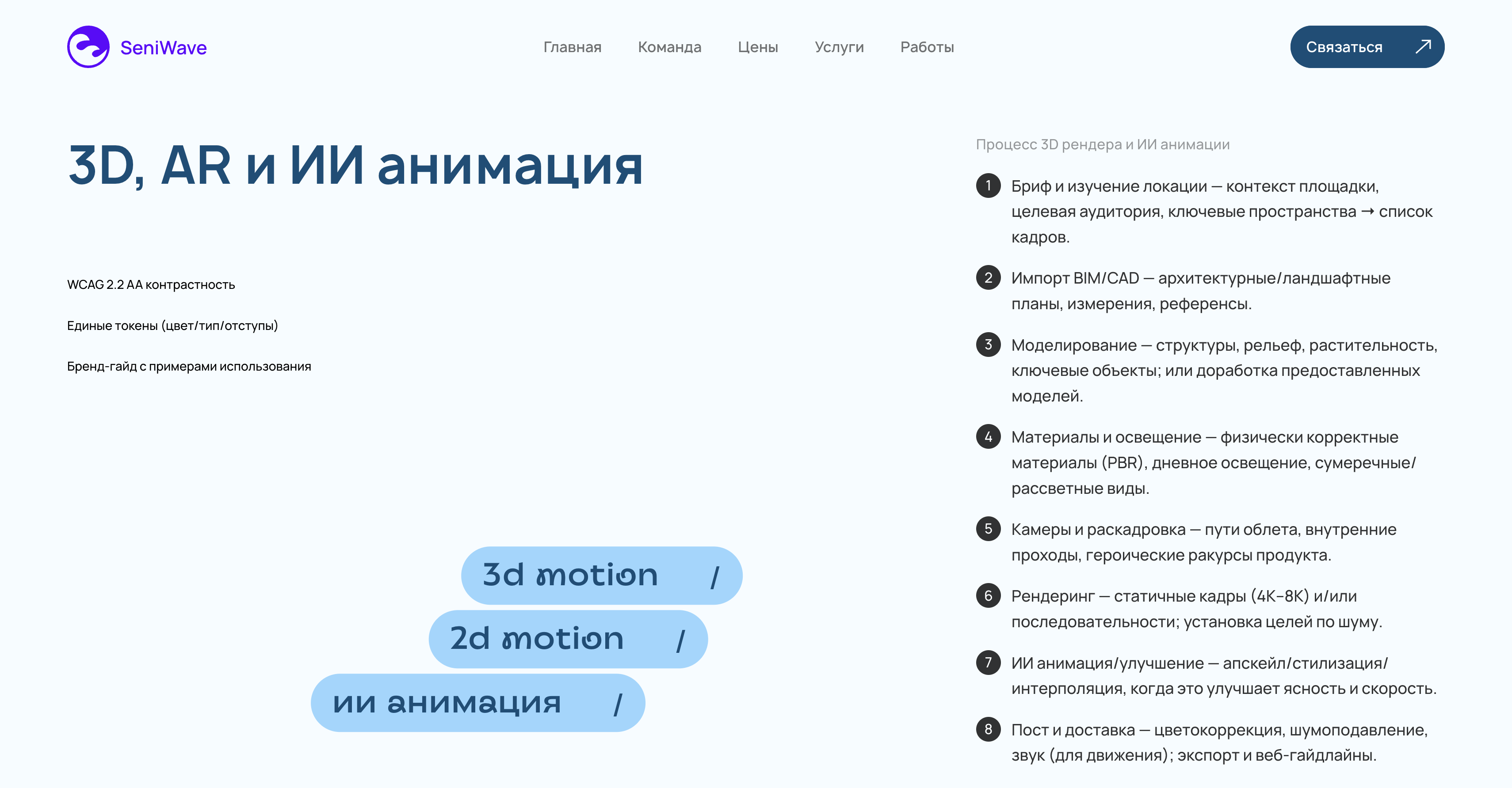 • создана структура, отражающая ключевые направления студии (Web, 3D, Branding, AI-Visuals);